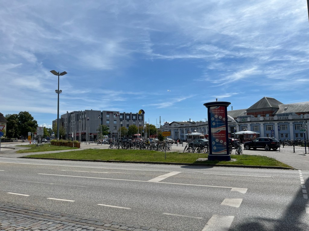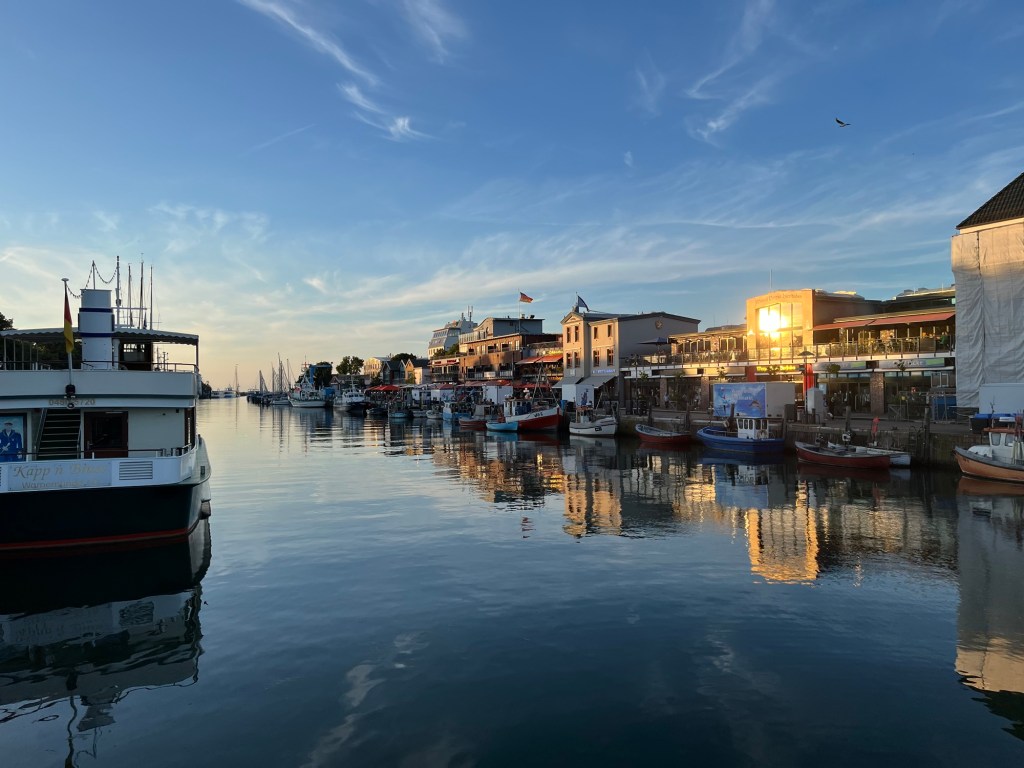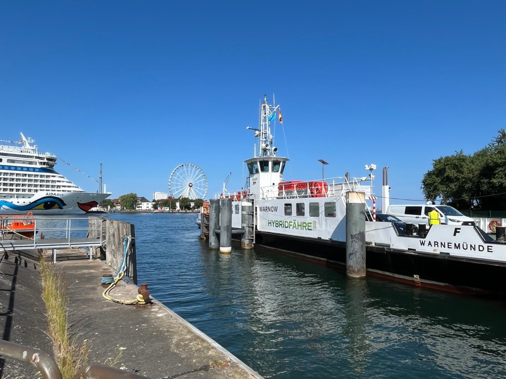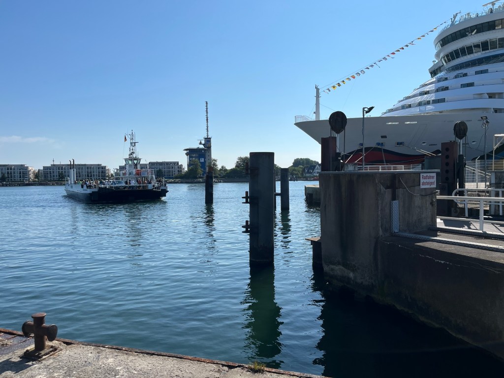 On récupère nos vélos au sous-sol et on rejoint la station de S-Bahn la plus proche, celle de Parkstrasse, à 3 km. On prend le train de 9h11 pour Warnemünde, point de départ officiel de notre itinéraire (j’attrape les tics de langage de Philipp, il faut que je me reprenne !), où on arrive à 9h31. La prochaine étape, c’est le ferry qui va nous permettre de traverser et d’entamer notre périple toujours plus vers l’Est.