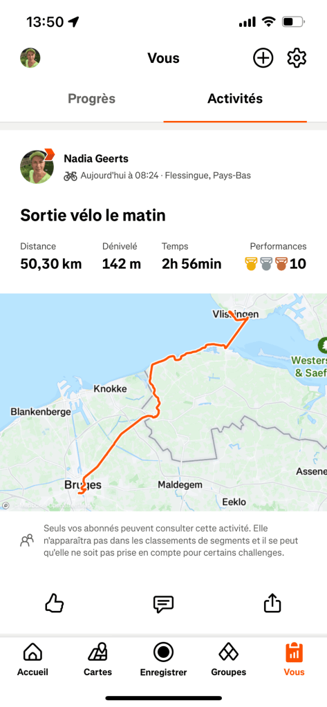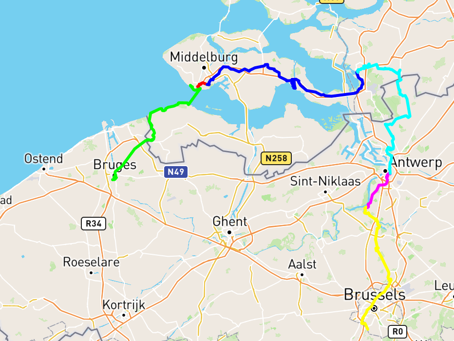 Finalement, je ne tarde pas à repartir après avoir mis ma montre à charger et en utilisant Strava pour enregistrer mon itinéraire. Mais les crampes reprennent de plus belle, ça devient insupportable, je m’arrête donc au bord du canal qui mène à Middelburg, que je viens de rejoindre. Je ne suis vraiment plus loin du but, et ne tarde donc pas à repartir après avoir enclenché cette fois Komoot, ce qui explique que j’ai trois tronçons pour la journée d’aujourd’hui !