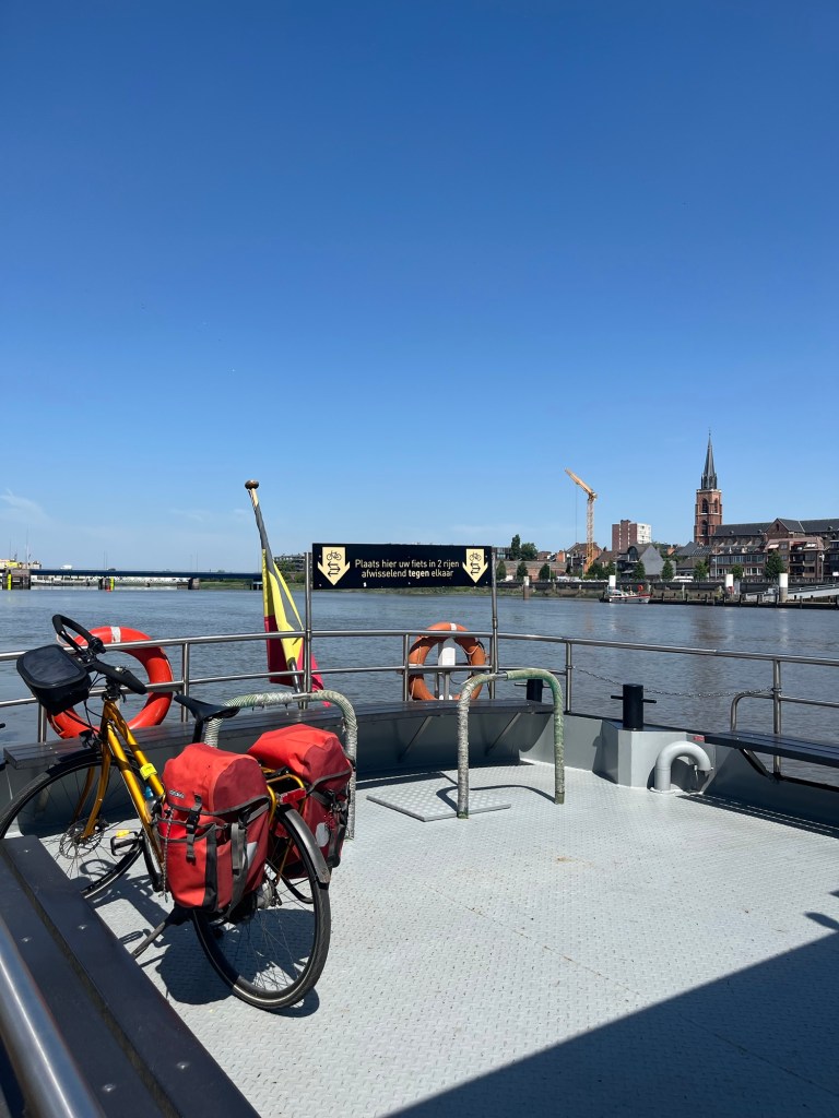 Heureusement, à peine repartie, j’aperçois le bac, et de l’autre côté des terrasses et des parasols ! J’embarque donc. Le bac démarre à 12h, on est deux cyclistes à bord.