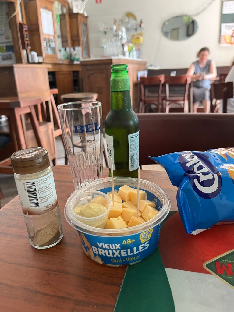 Il est donc 12h20 quand je fais enfin ma pause repas (faut le dire vite… chips et portion de fromage) à Noeveren. J’ai fait 47 km et vu un thermomètre à Boom qui indiquait 39 degrés ! Enfin, je ne suis plus qu’à 20km d’Anvers à tout casser, je devrais y arriver ! Après trois bières (sans alcool) et ma petite collation, je me sens un peu mieux. Je réserve une chambre d’hôtel à Anvers : après une nuit de 4h et ces kilomètres dans la fournaise, j’ai bien besoin du confort d’une chambre d’hôtel et, surtout, de pouvoir y arriver tôt !