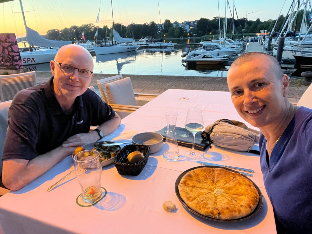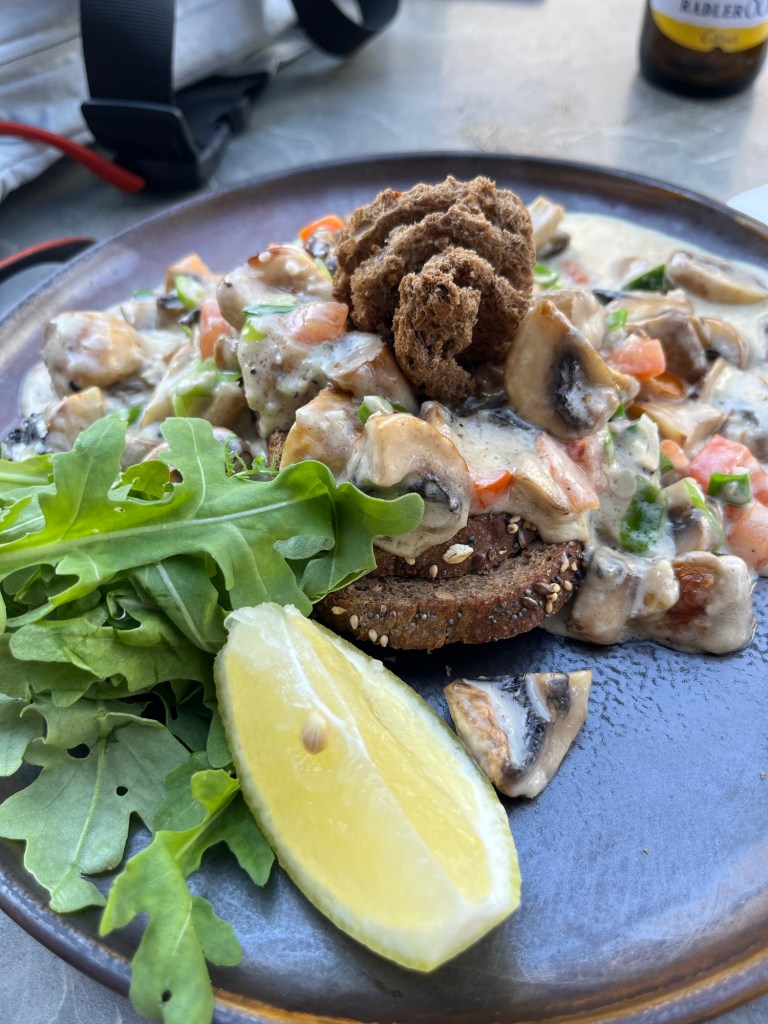 En fin de journée, après une bonne douche et mes habituelles écritures, je repars mettre mon vélo en sécurité au parking de l’hôtel, puis chercher un endroit où manger. Je m’installe à la terrasse de chez René et commande un radler et un toast aux champignons. Peu après 19h, je suis de retour dans ma chambre, crevée !