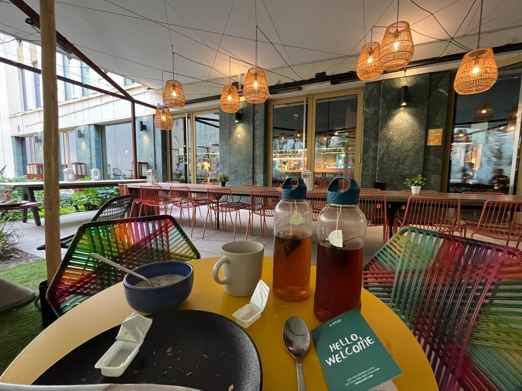 On se lève à 6h40 après une très bonne nuit. Le petit-déjeuner est à 8h, on a donc le temps d’empaqueter un maximum de nos affaires avant de descendre manger.
