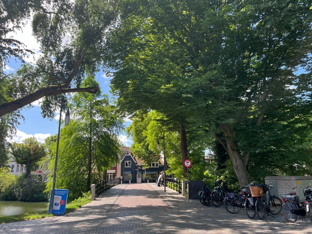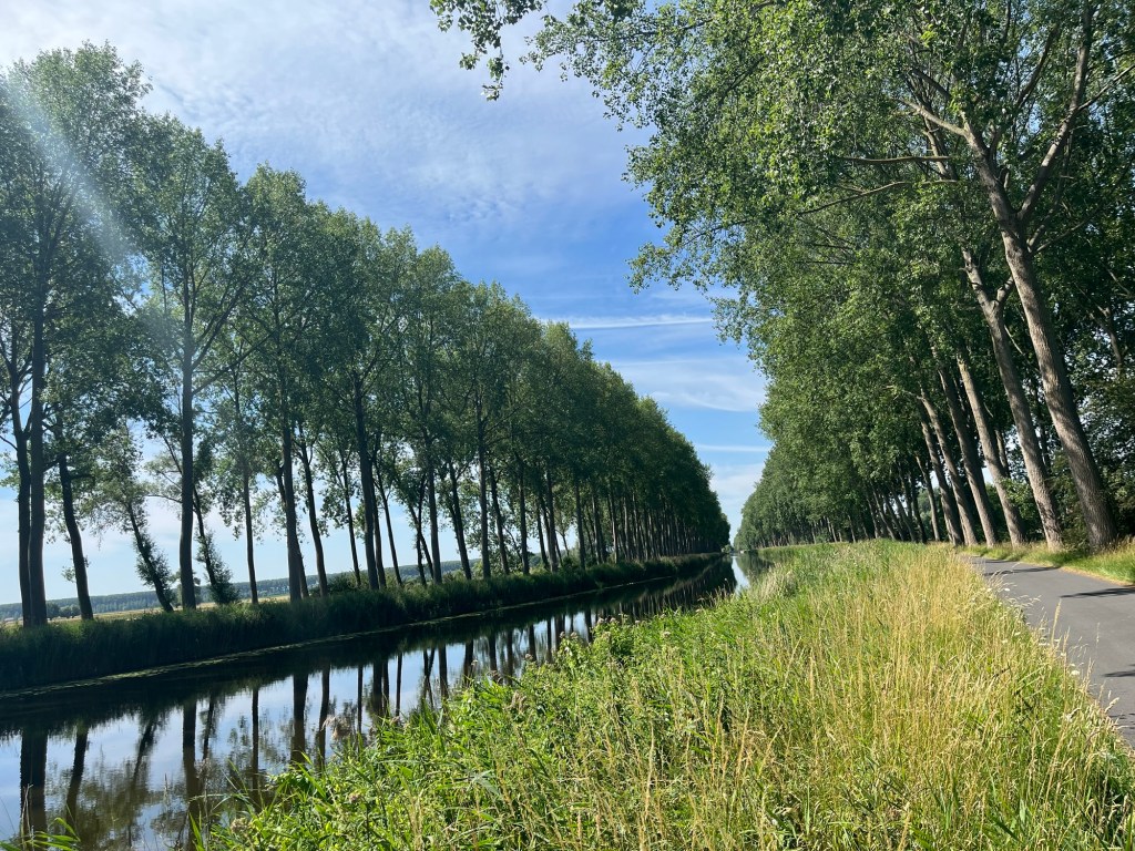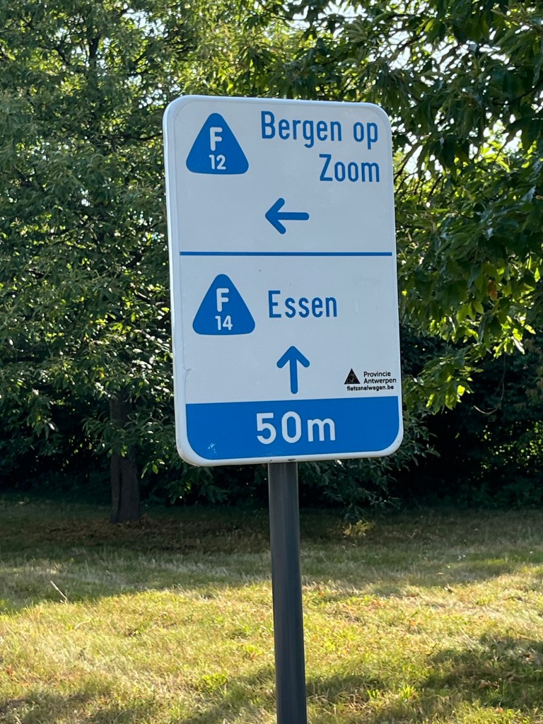 Je ne tarde pas à voir des panneaux F12, qui indiquent la direction de Bergen-op-Zoom, et je décide de les suivre, car cela ressemble fort à une autoroute cycliste, bien ombragée qui plus est. Cela me fait dévier de l’itinéraire Komoot que j’avais préparé, mais tant pis. On verra bien… je m’arrête une première fois après avoir parcouru près de 8 km et en ayant roulé même pas une demi-heure, mais il fait déjà étouffant !