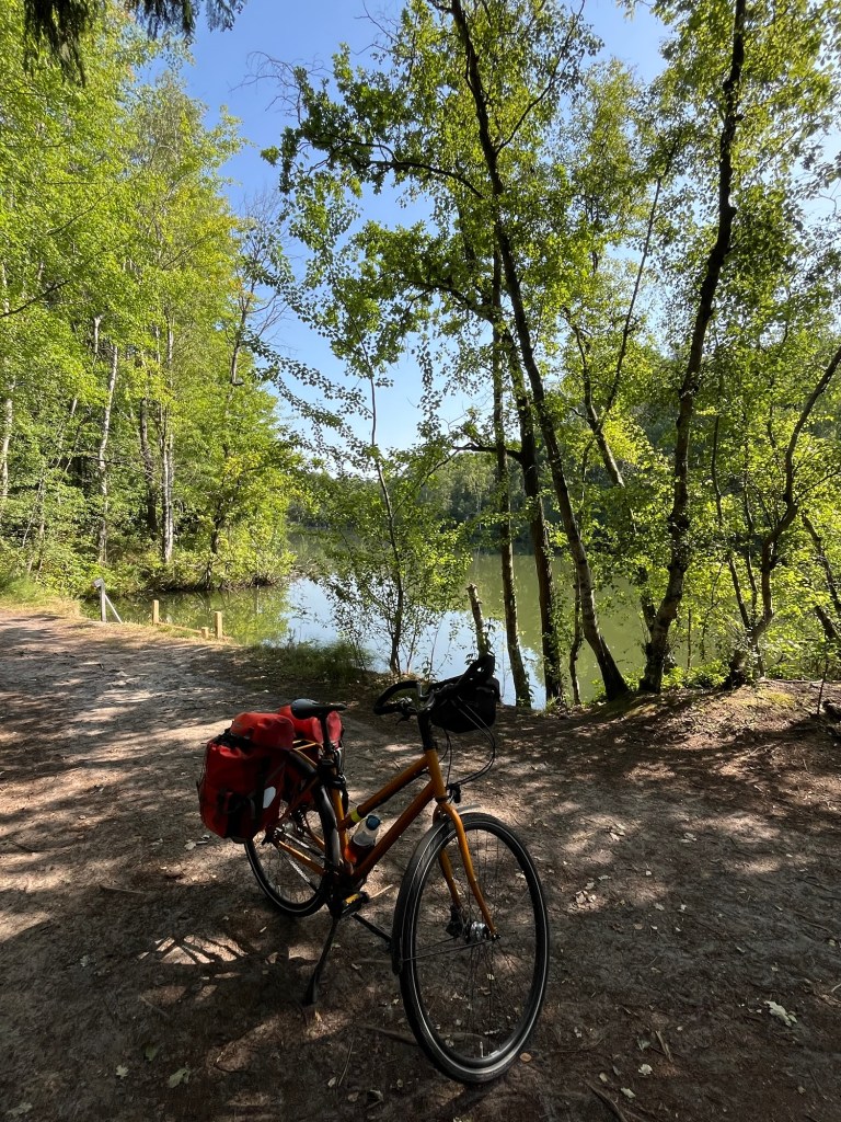 Je me mets en route un peu avant huit heures, je rejoins rapidement le lac, où je découvre qu’il y a même des plages, puis poursuis ma route par un magnifique itinéraire à travers la campagne qui me fait rejoindre la LF 13 après 5 km. Pas pour longtemps malheureusement, puisque je bifurque le long de la N 289.