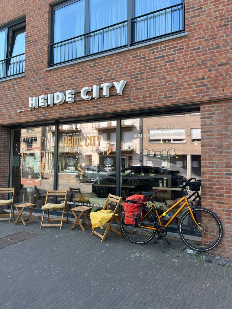 Je prends une dernière bière en terrasse (à l’ombre) histoire de me réacclimater à la chaleur et de lire un peu en ayant un œil sur mon vélo, puis vers 13h40 je me remets en route vers Anvers et mon hôtel !