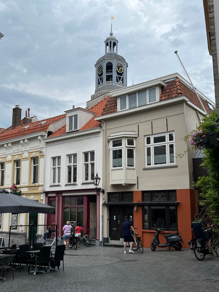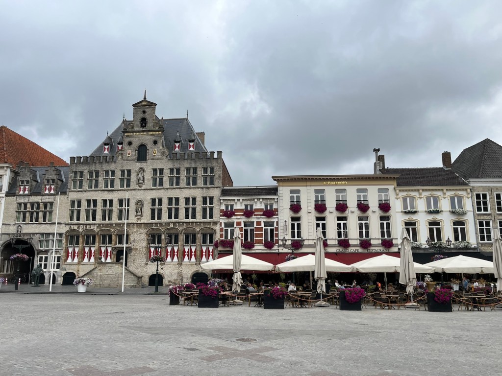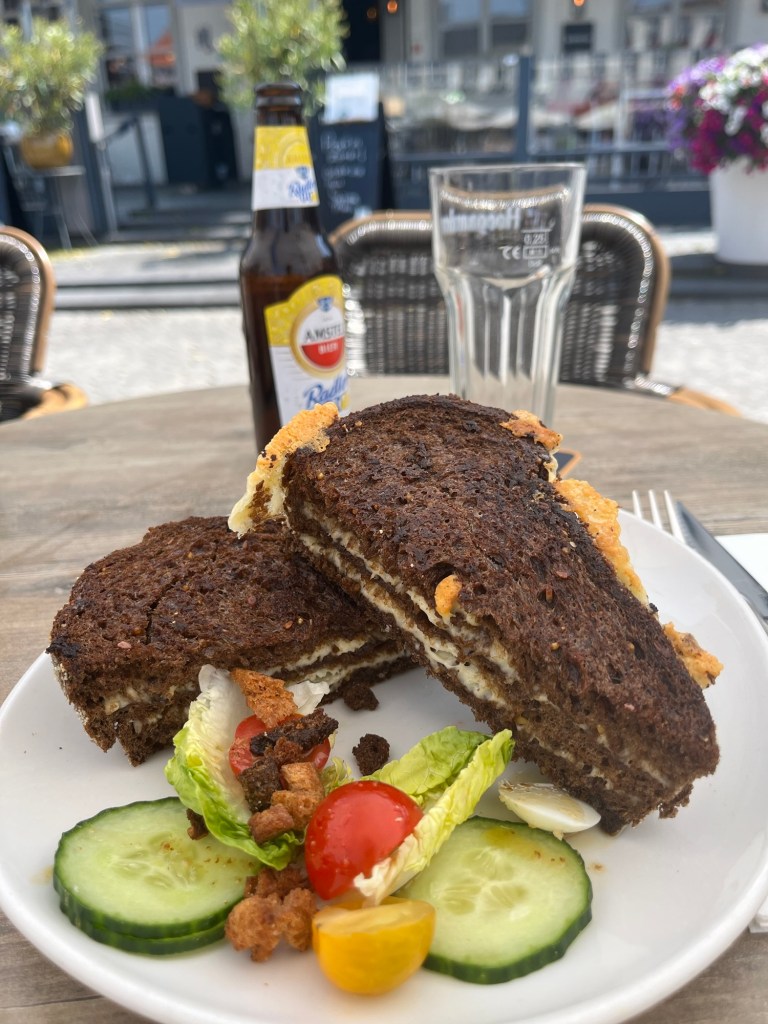 À 14h15, j’arrive sur le Markt de Bergen-op-Zoom après 67 km, et m’installe à la terrasse du Times, où je m’offre un Radler et un croque-monsieur – sans jambon évidemment. Le temps a changé, le vent s’est levé (je l’ai malheureusement de face) et le ciel s’est un peu couvert.