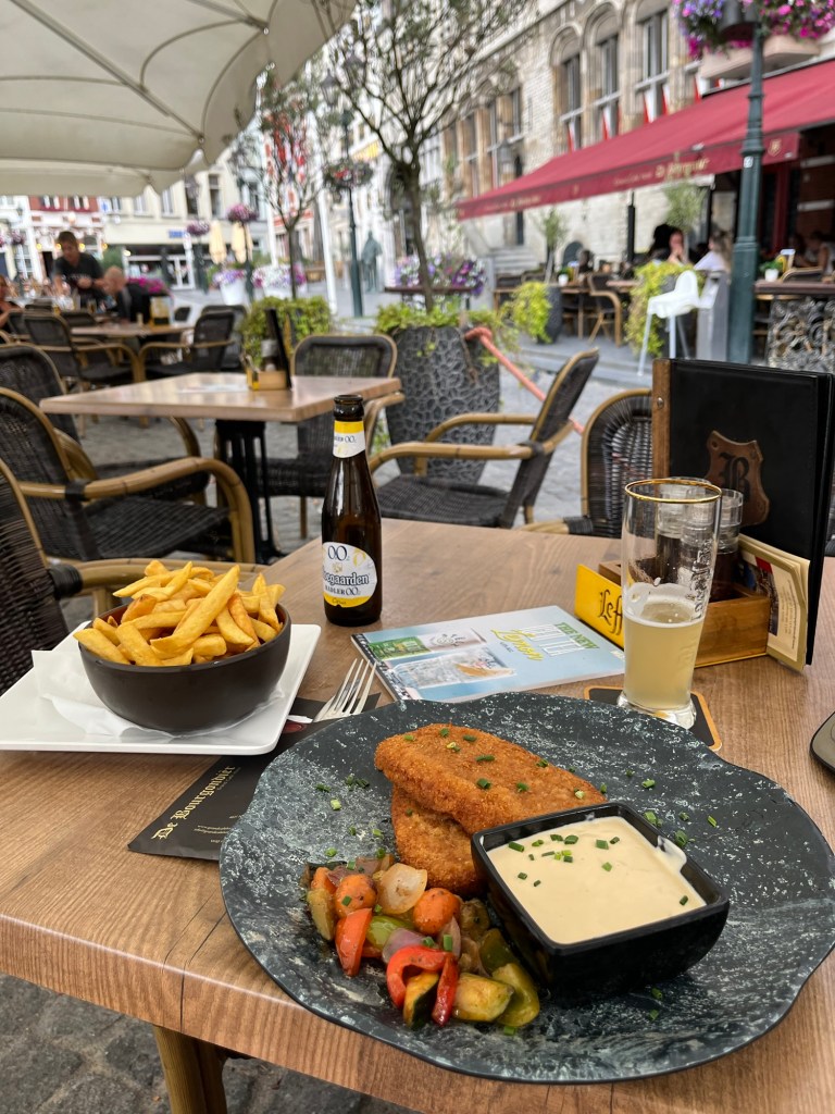Je repars à pied vers 18 heures en direction du centre-ville, et m’installe en terrasse sur le Markt, au grand café restaurant De Bourgondier. Il est tombé déjà quelques gouttes quand j’ai quitté l’hôtel, mais il se met à tomber des cordes, heureusement le parasol qui me protège à l’air bien imperméable. Je m’offre un schnitzel végétarien à la sauce champignons – sauce dans laquelle il doit y avoir au maximum deux petits champignons de Paris, mais ça nourrit – ainsi qu’un petit verre de vin blanc (deux) pour agrémenter mon repas. Je rentre à l’hôtel vers 20h30, la pluie a cessé et le temps s’est bien rafraîchi.