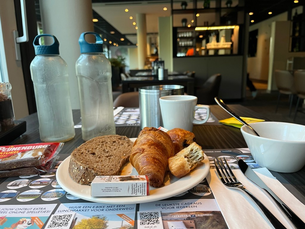 Jeudi 3 juillet. Je m’éveille à 6h30 et sens bien que la nuit est terminée. Je suis donc au petit-déjeuner avant 7h, mais avant ça je peaufine mon itinéraire : je décide de renoncer à passer par Tholen, d’aller directement à Vlissingen et de m’y prendre un hôtel sur le Boulevard !