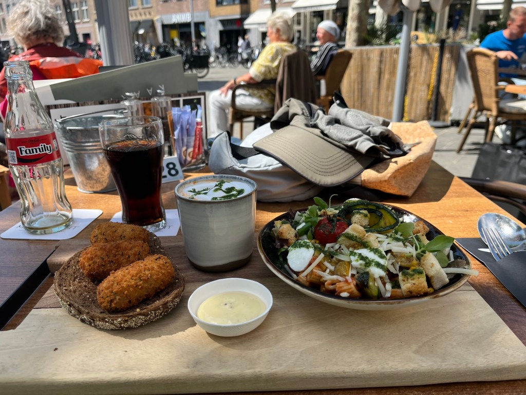 Quitter Hansweert est un peu laborieux car de gros travaux de rehaussement des digues sont en cours. Mais je finis par m’en sortir et à 11h40, après 48 km, j’arrive à Goes. Je roule jusqu’au Markt et m’installe à la terrasse du bien nommé Marktzicht, où je déguste une délicieuse vegetarische plank : une petite soupe tomate-crème, trois petites croquettes au fromage et une petite salade de pâtes !
