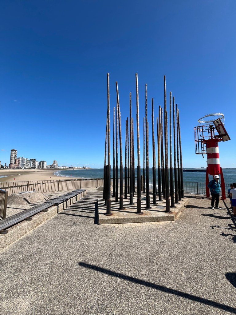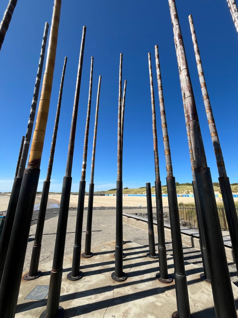 Tout au bout de la digue, je découvre une étrange sculpture faite de gigantesques tubes de bambou dans lesquelles on a pratiqué des fentes, ce qui produit de la musique quand le vent souffle dedans.