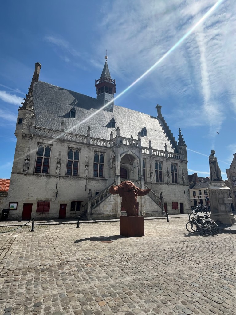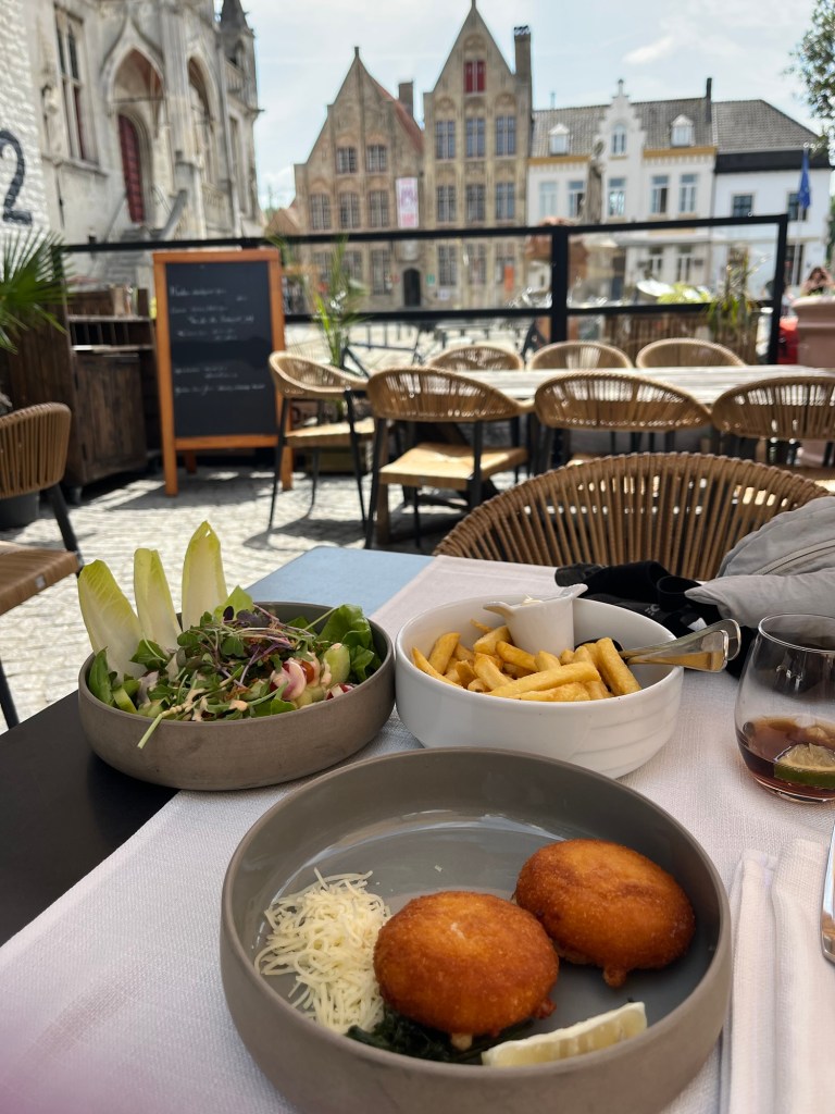 A 11h50, après 40 km dont une dizaine le long du canal, j’arrive à Damme. Il y fait relativement calme, et je m’installe à la terrasse du M12, non sans un coup d’œil ému vers l’établissement De Lamme Goedzak et le Uilenspiegel-museum… L’esprit frondeur et l’anticléricalisme potache ne sont plus de saison, les curés et autres pères (et mères) la morale sont de retour. Mais bref, passons… Une fois encore, je ne me refuse rien : kaaskrokketten, supplément frites et supplément salade verte.