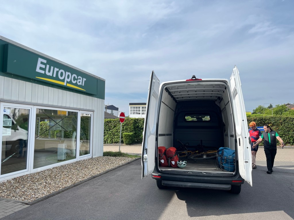 Trois petits kilomètres à vélo, et on arrive à la station Europcar, où on prend possession de notre camionnette, dans laquelle on pourrait facilement mettre 8 vélos ! À 10h, j’ai enfin trouvé comment démarrer l’engin, c’est parti pour la traversée de l’Allemagne !