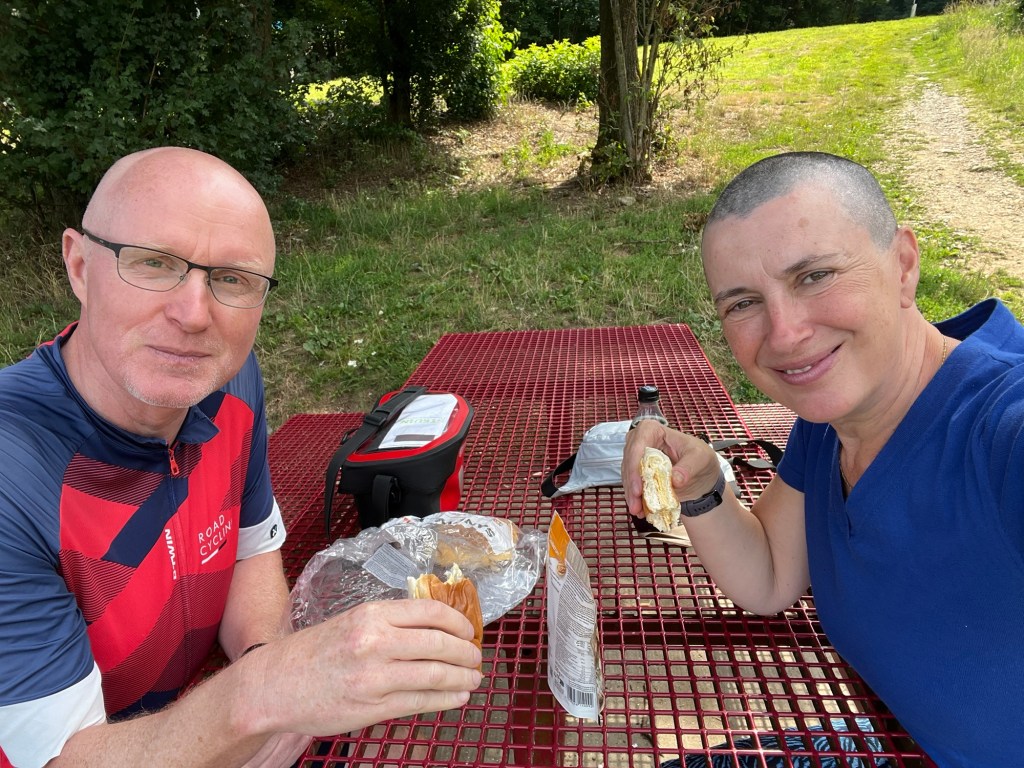 On emprunte ensuite une piste cyclable dans une réserve naturelle. C’est magnifique, et au bout de quelques kilomètres on s’arrête pour une pause repas : il fait beau, il y a des bancs, des chèvres, de l’ombre, bref c’est parfait ! Mais il y a tellement de moustiques qu’on renonce et se remet en route. La piste continue longtemps, avec quelques belles montées suivies d’encore plus belles descentes, au début j’adore ça, mais ça fatigue, d’autant que finalement, il est 13h35 et on a fait 54km quand on s’arrête enfin ! En plus, toute à ces montées et ces descentes, j’ai oublié de fermer la bouche et avalé un insecte qui me fait tousser…