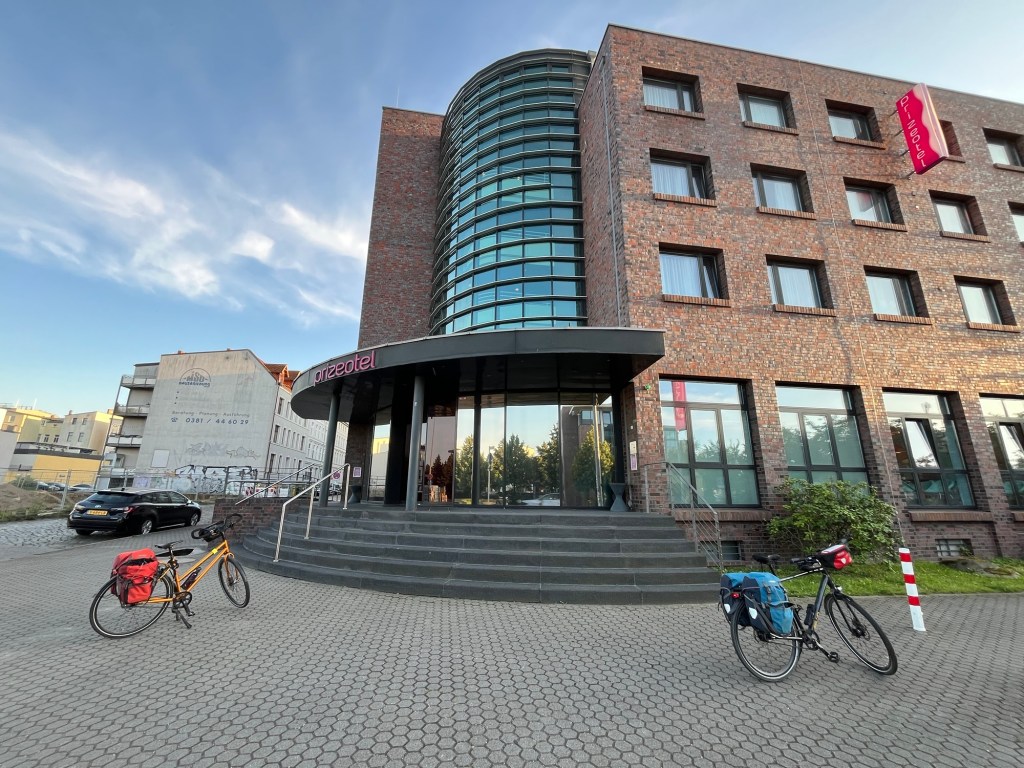 On finit par arriver, forcément, et il est un petit peu avant 20h quand, après avoir refait le plein, on gare notre carrosse sur le parking de l’Europcar de Rostock, un peu étonnés que personne ne vienne nous accueillir et vérifier que tout est en ordre. Qu’à cela ne tienne, on enfourche nos vélos et on fait les 100 mètres qui nous séparent de notre hôtel.
