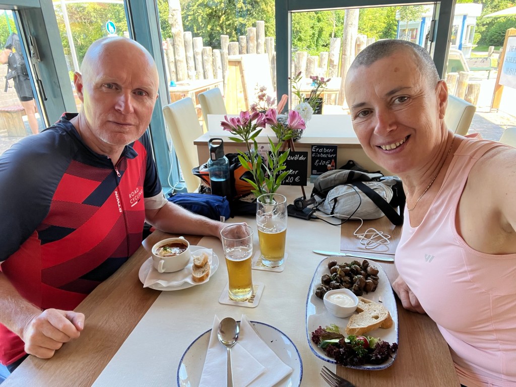 À 11h40 on s’arrête au Strandhus Restaurant à Graal-Müritz après avoir roulé 19km seulement. On s’offre un repas léger (trop léger à mon goût : champignons grillés et baguette, la baguette se limitant à deux fines tranches … Philipp a quant à lui opté pour une soljanka, une soupe russe restée très courante dans la région.