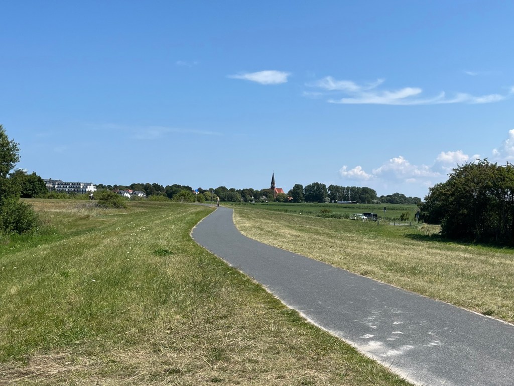 On se remet en route à 12h30, on traverse à nouveau des paysages magnifiques souvent bien arborés, ce qui n’est pas négligeable par cette chaleur. Puis on empreinte une piste cyclable goudronnée, extraordinairement confortable en comparaison de ce qu’on a eu précédemment, et heureusement puisque c’est justement le moment où on commence à avoir le vent bien de face . Malgré tout, on avance à un bon rythme et on arrive bientôt en vue de Wustrow, dont l’église se profile dans un paysage parfaitement plat.