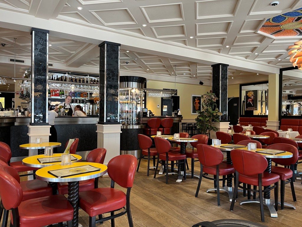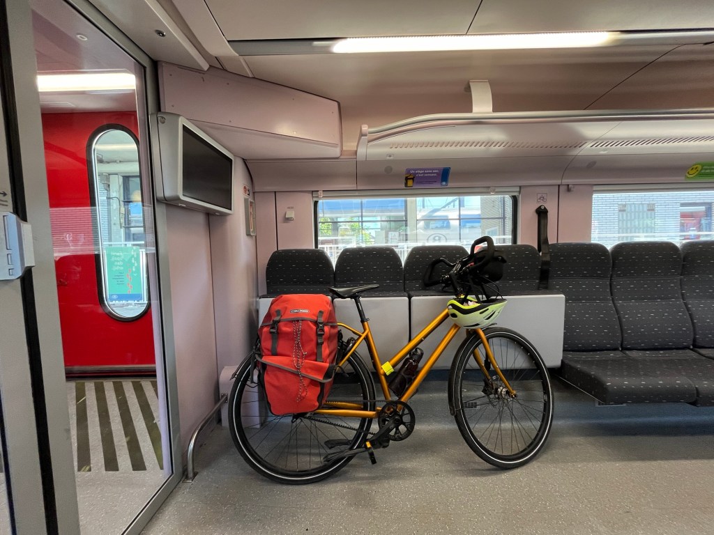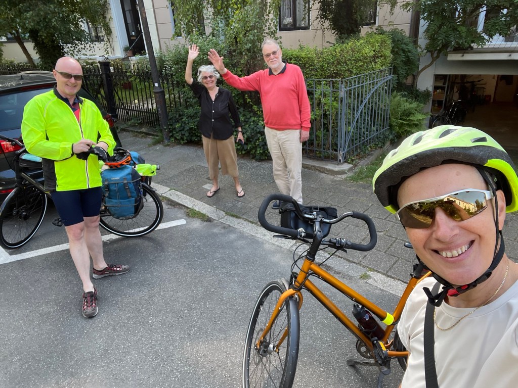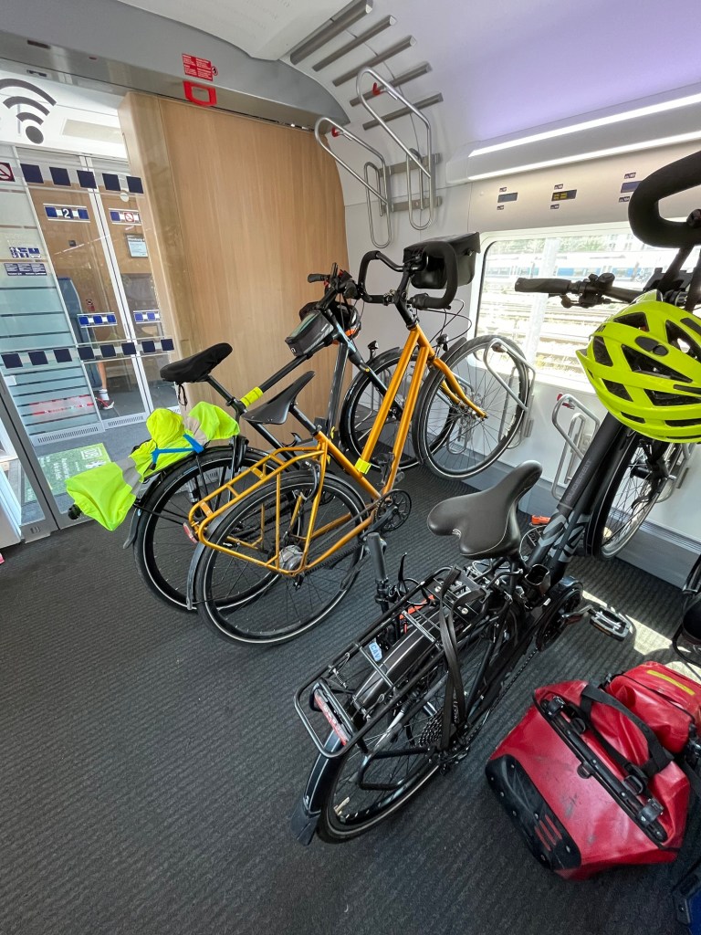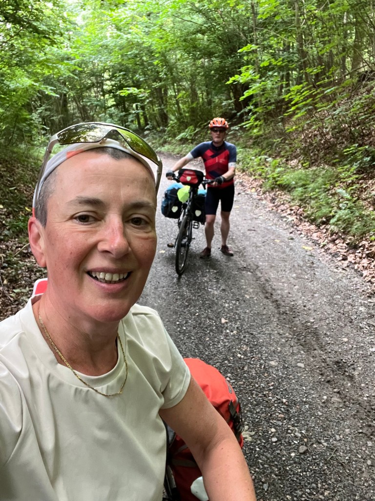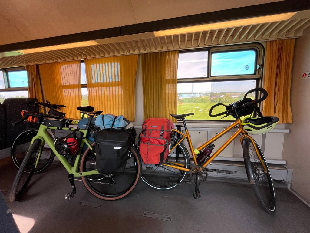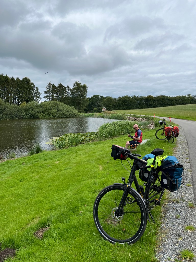 On s’éveille à 6h et on est à 6h30 au petit déjeuner. C’est qu’on a une longue journée de vélo devant nous – du moins c’est ce qu’on croit, puisqu’on estime notre trajet du jour à 90km. Il fait un peu gris, mais les nuages font rapidement place à un grand soleil. Pour un peu, on pourrait prendre le petit déjeuner sur la terrasse de l’hôtel !