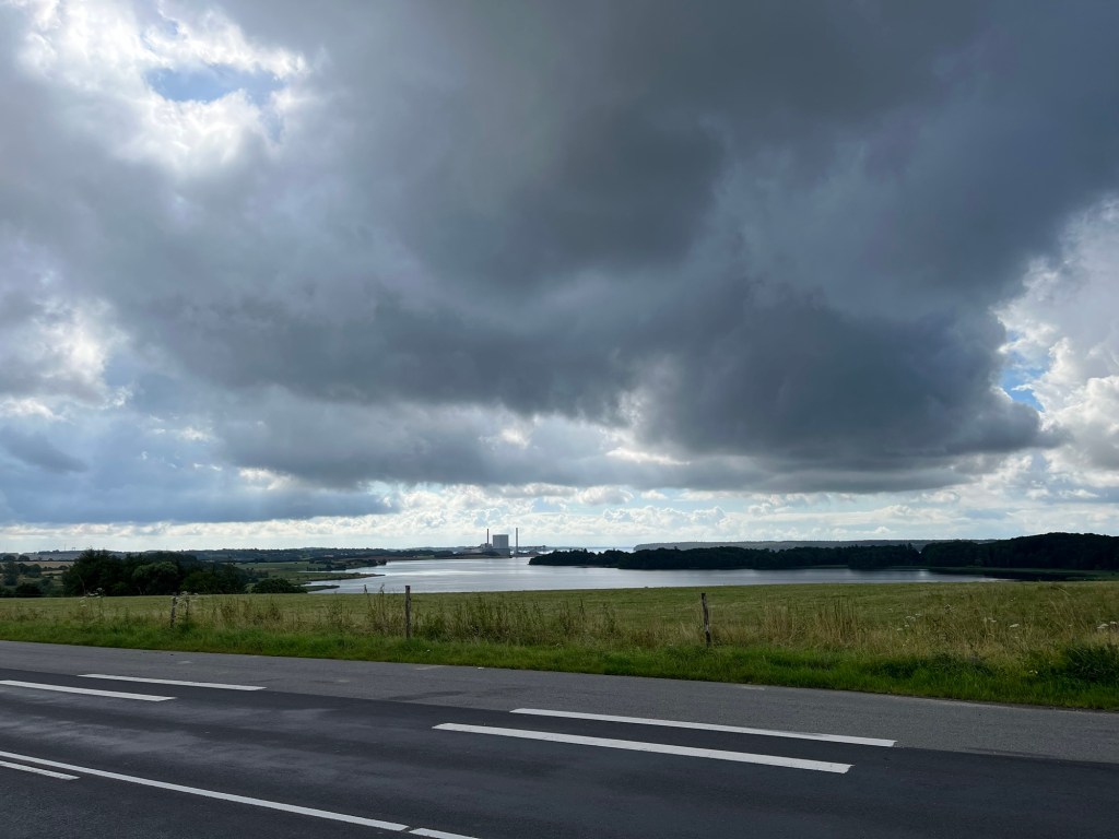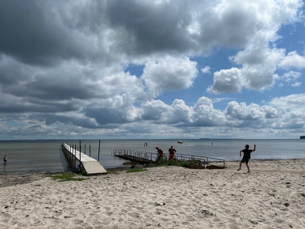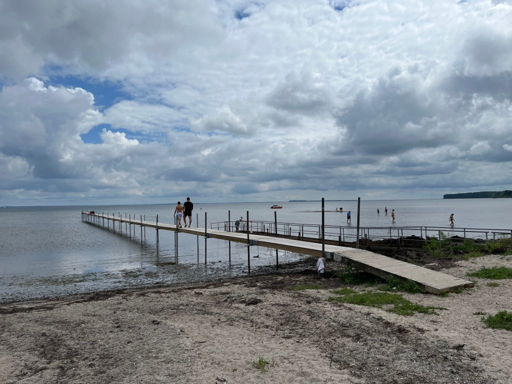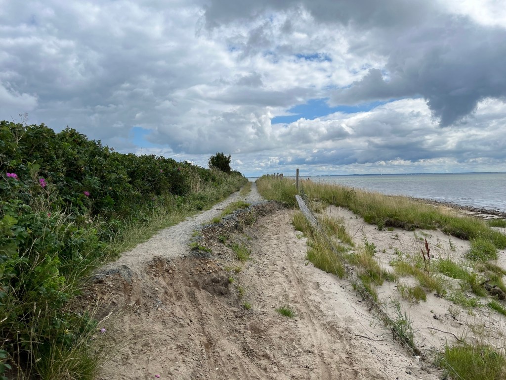 Ensuite on prend une magnifique « autoroute » cycliste, qui longe une réserve naturelle, puis une plage de sable blanc, sur près de dix kilomètres. On a le vent dans le dos, et on avance donc à vive allure, avec un paysage magnifique, tant sur notre gauche (la plage et la mer) que sur notre droite : une forêt de sapins, et dedans des maisons dont on n’aperçoit que le petit toit pointu.