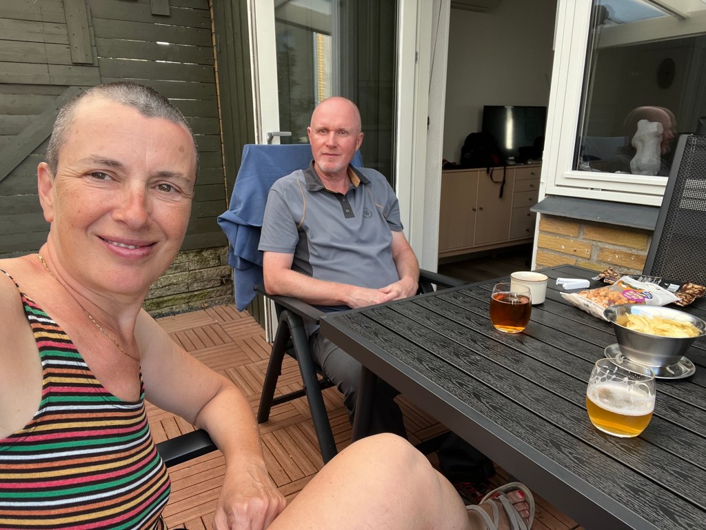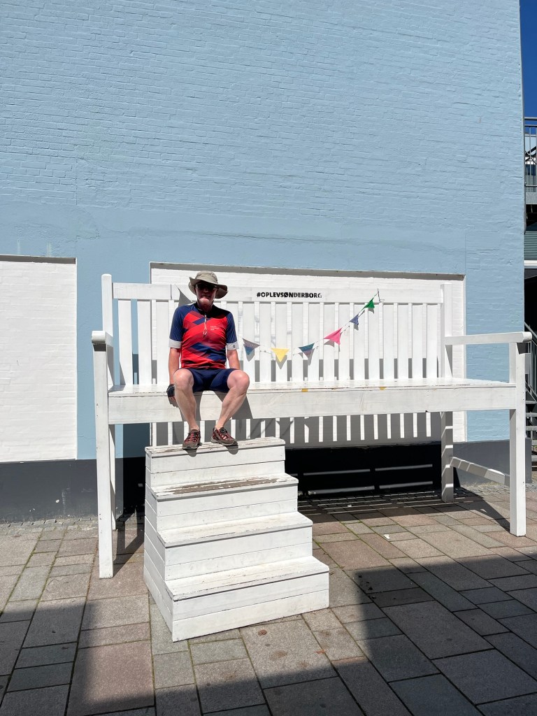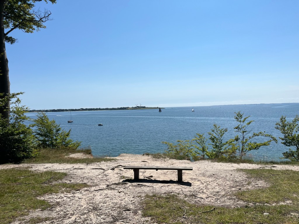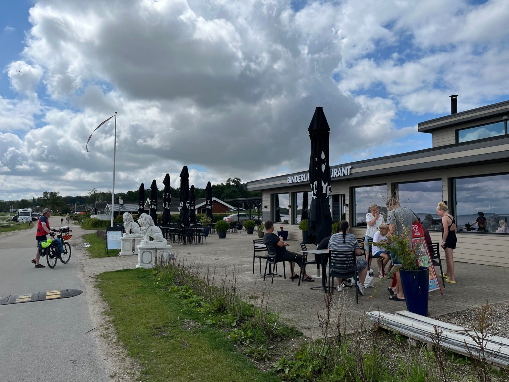 Quand on s’arrête pour manger, à 12h15, on a déjà fait 59 kilomètres ! On jette notre dévolu sur la terrasse du Genueser Schiff, Strandkorb Café bar & bistro, quelque part entre Lippe et Hohwacht. Leurs Strandkörbe nous tendent les bras, et la plage est toute proche ! Que demander de mieux par un beau temps comme ça ?