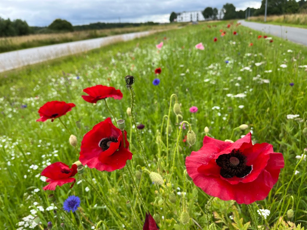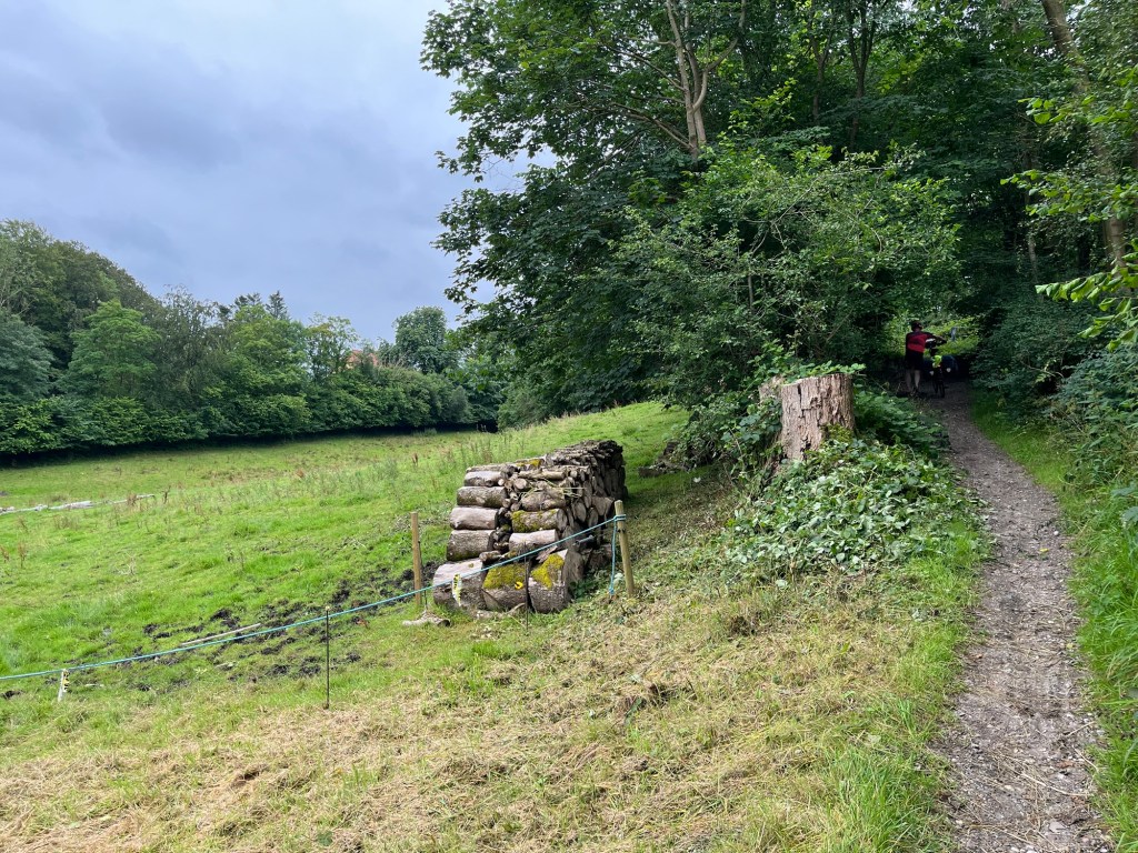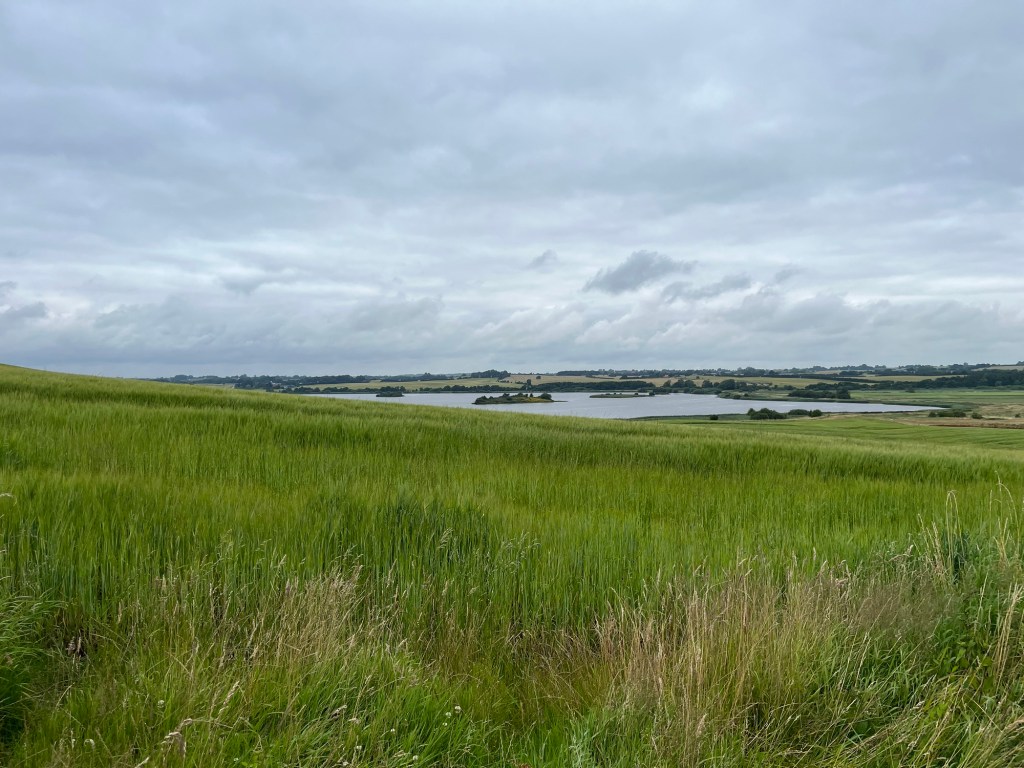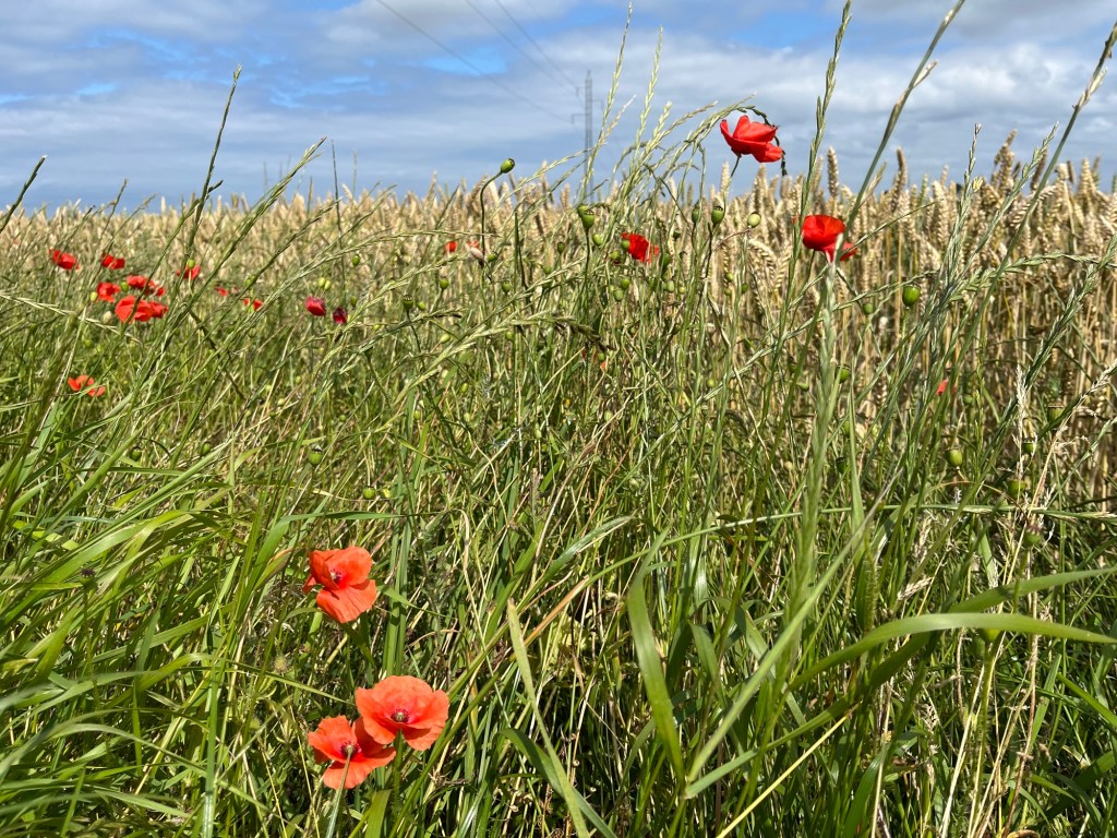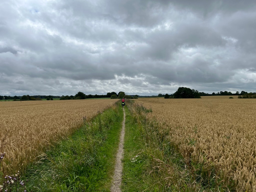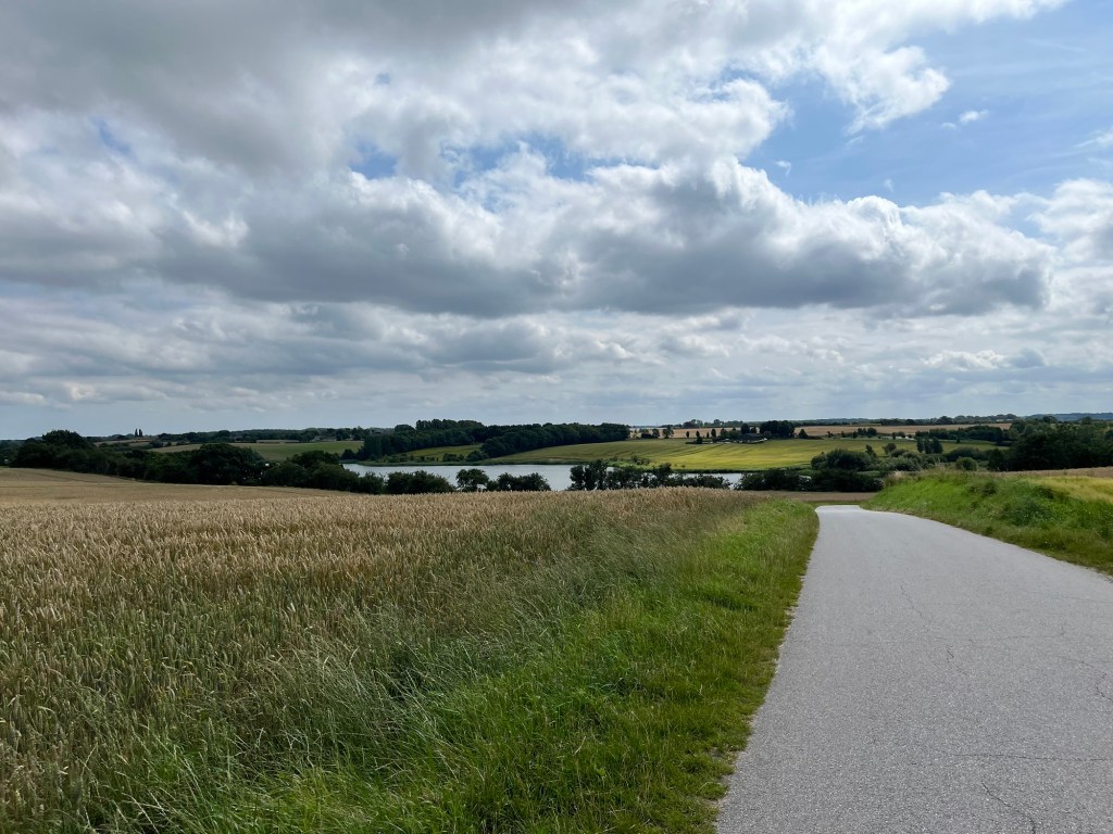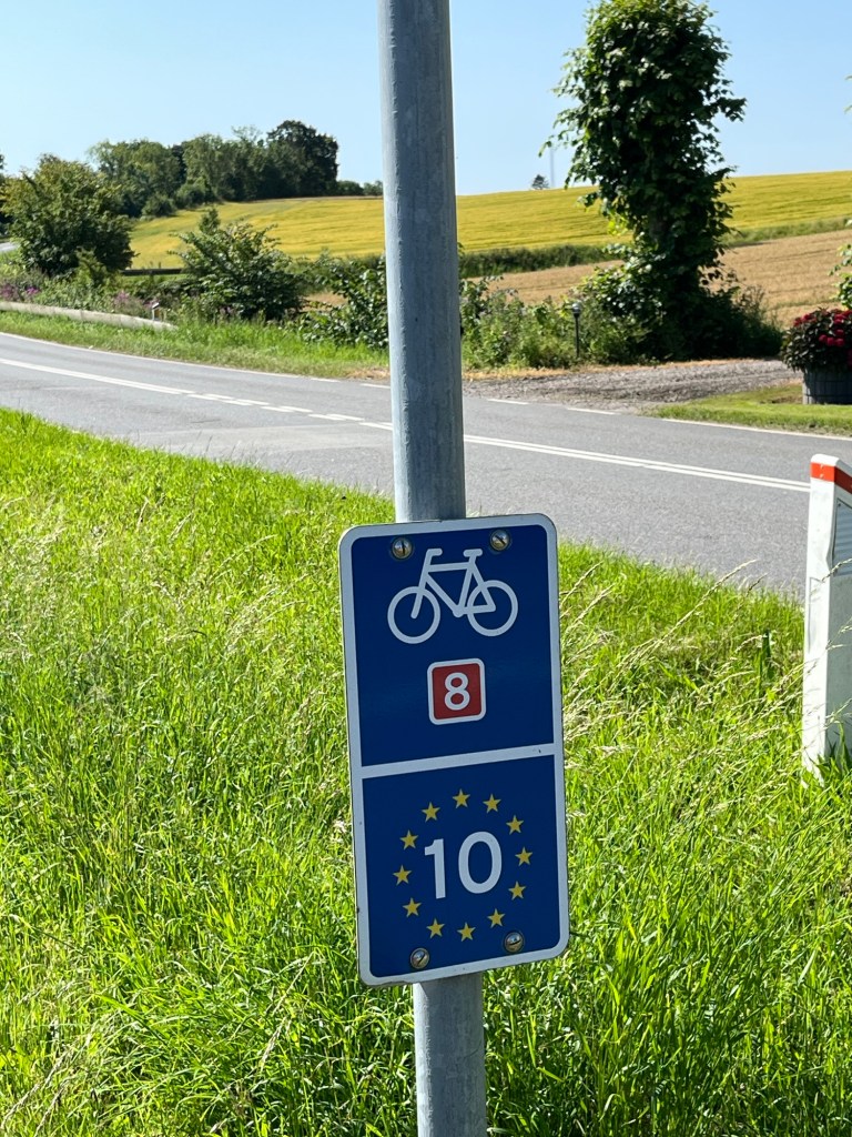 On emprunte ensuite un chemin sinueux de coquillages concassés longeant des champs de maïs, puis des tronçons parfaitement asphaltés, puis à nouveau des sentiers étroits. On dirait qu’ils se sont amusés à varier les revêtements, les largeurs, etc. pour amuser les cyclistes ! Je fais une petite chute sans gravité (sans gravité mais dans les orties) sur l’un d’entre eux alors que je tente de mettre pied à terre pour croiser un autre cycliste.