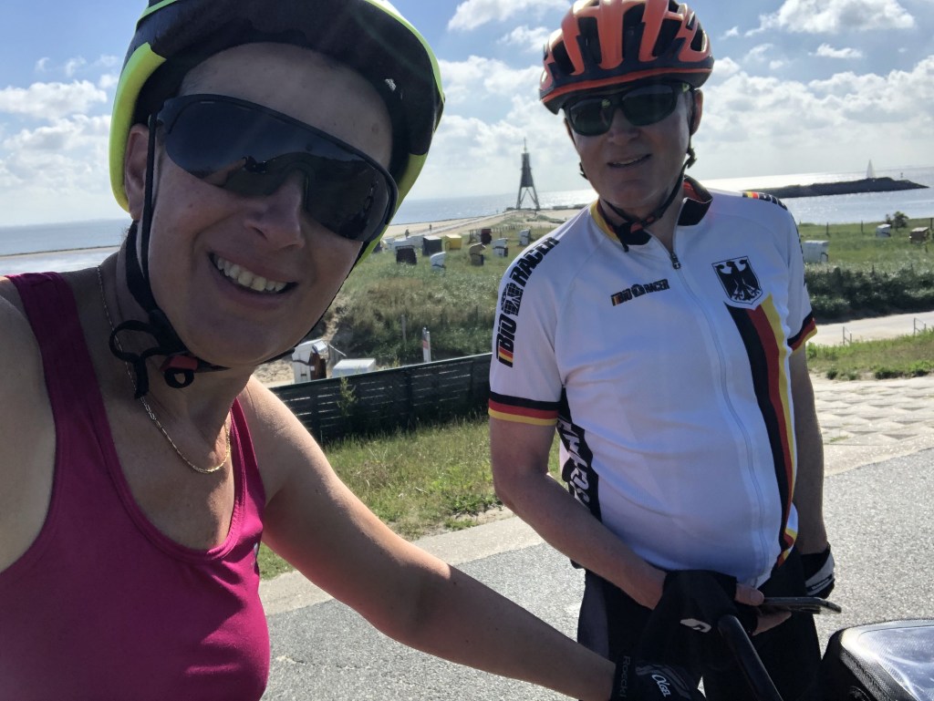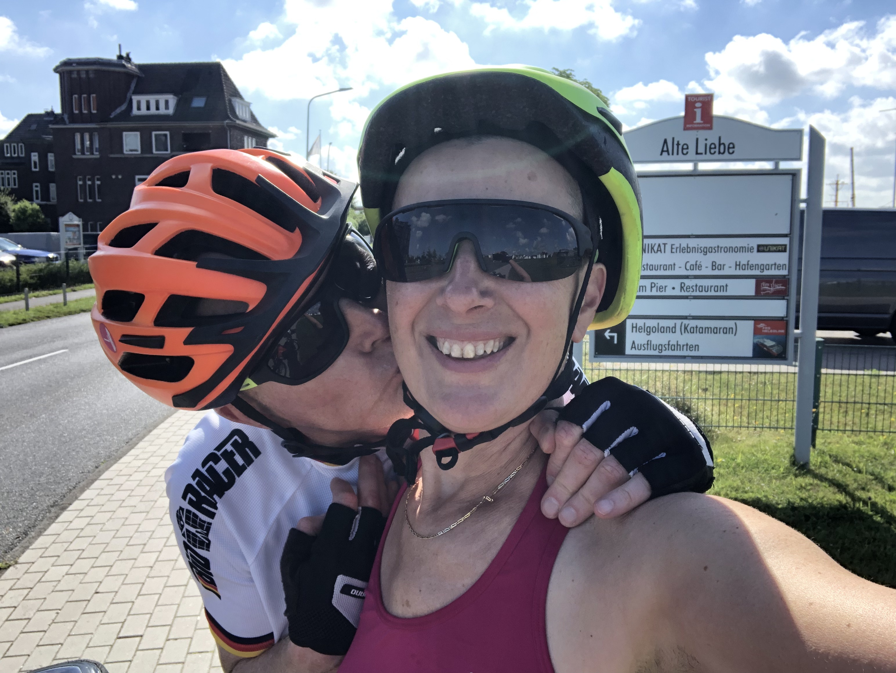 On repart donc en sens inverse, moi à vélo, Philipp à pied. À la pompe à essence, je sors mon plus bel allemand et je ne m’en sors pas trop mal : j’apprends qu’il y a un réparateur à 8km (au port, je l’ai vu hier soir près du resto…), et une pompe à l’office du tourisme juste en face de la pompe à essence. Malheureusement, à l’office du tourisme, ils ont une borne de réparation, mais pas de chambre à air, or vu la rapidité à laquelle le pneu de Philipp s’est dégonflé, il va certainement falloir la remplacer. Et celle que j’avais avec moi à déjà été utilisée pour mon vélo…