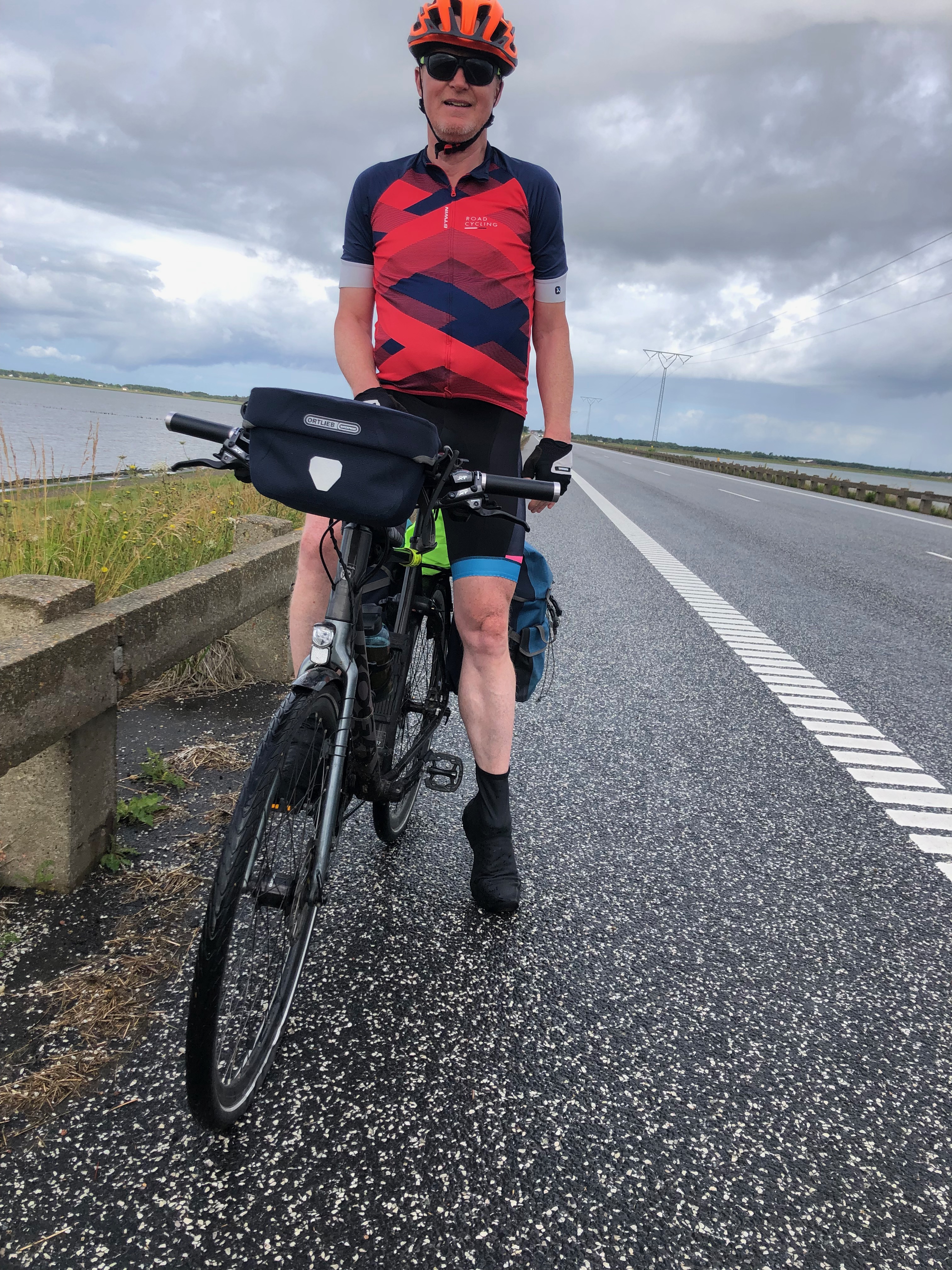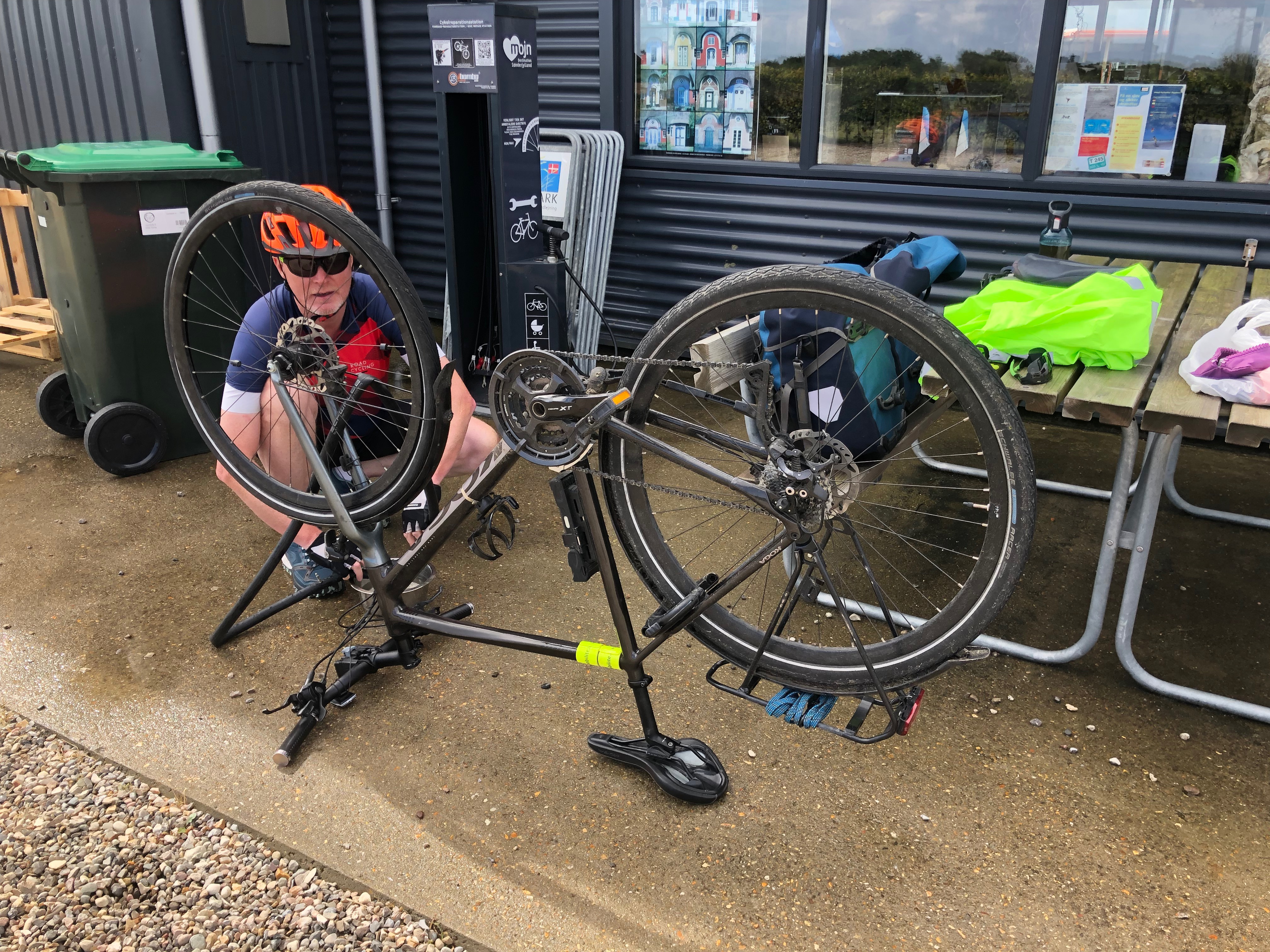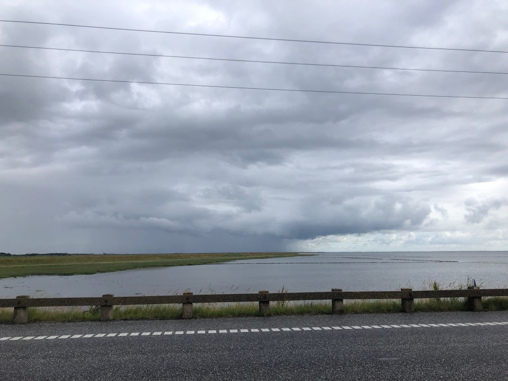 À 8h45, on se met en route, sous la pluie. On roule bien, il cesse de pleuvoir, après 7 km environ on entame la digue, ça va tout seul avec le vent dans le dos, on admire les paysages, la pluie qui tombe manifestement plus loin devant, plus loin à gauche, plus loin à droite, mais pas sur nous, bref c’est le bonheur, et puis Philipp m’appelle : son pneu avant est plat !