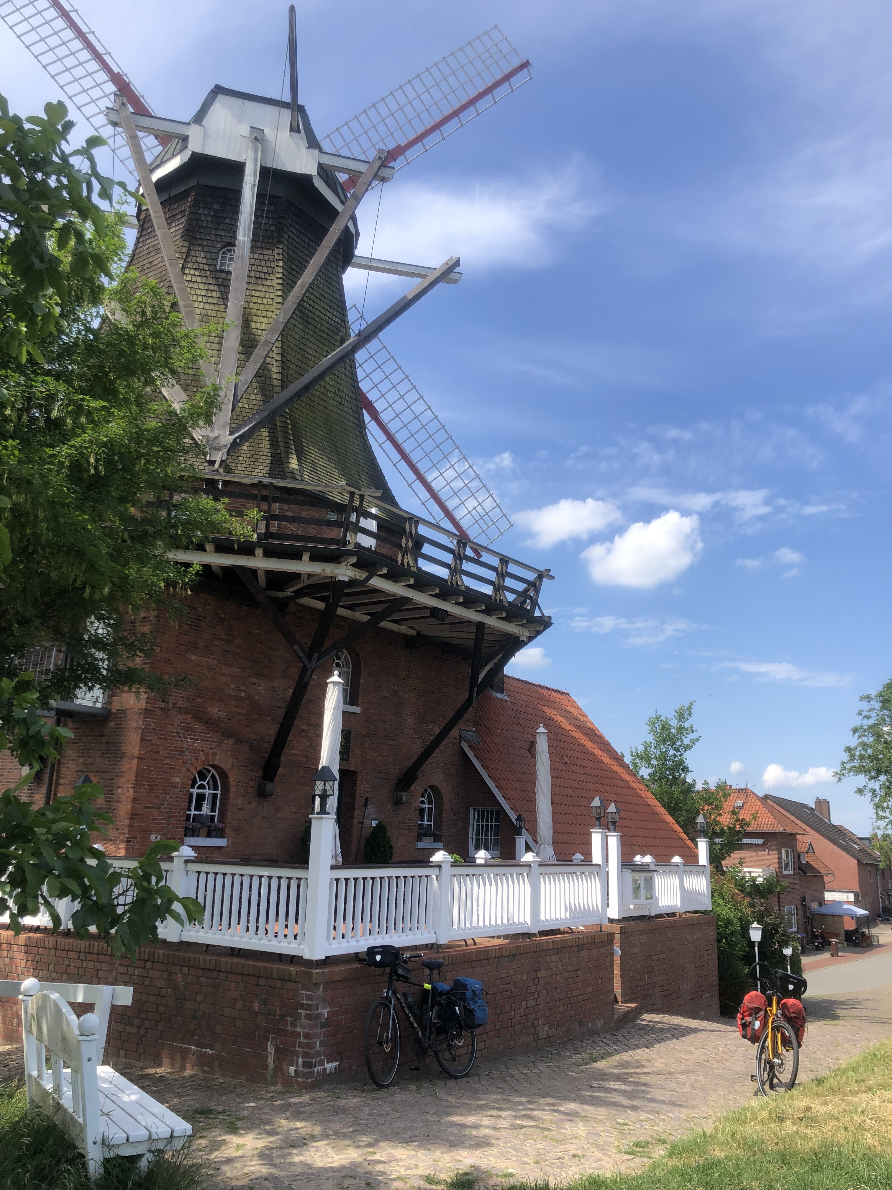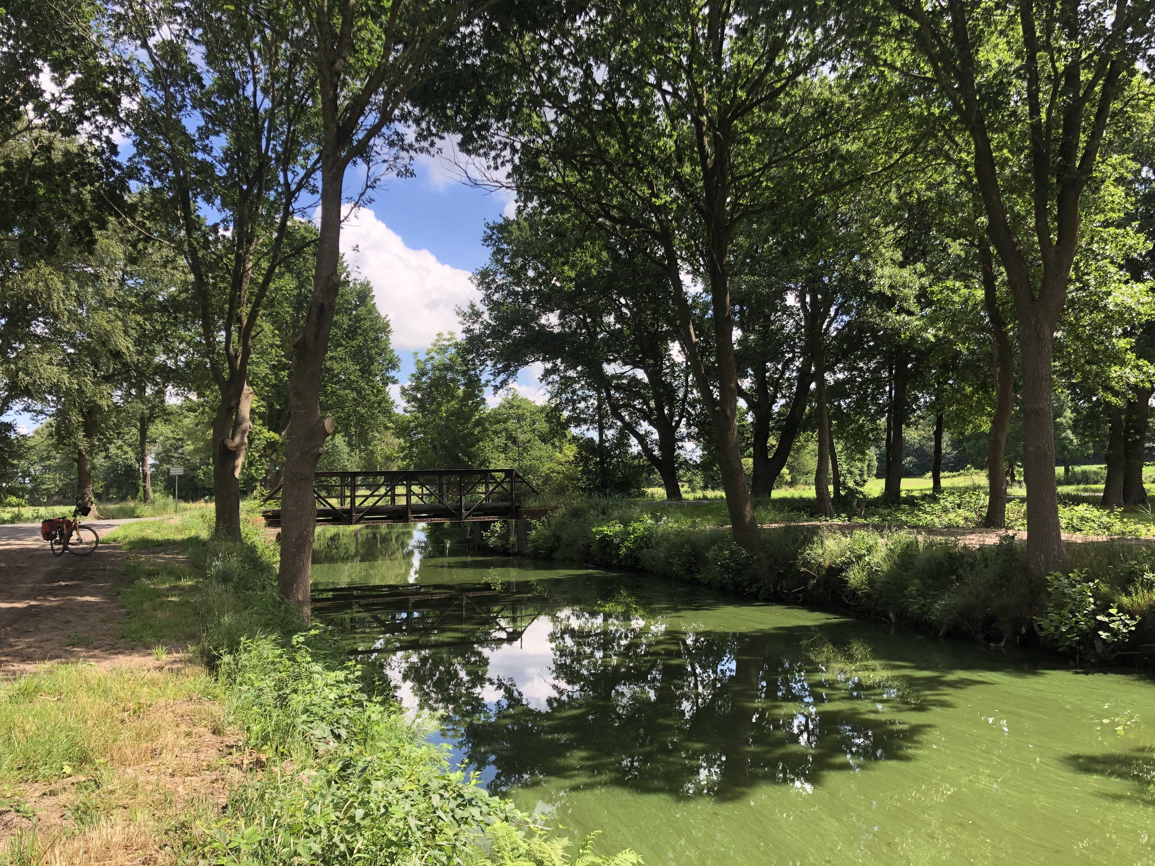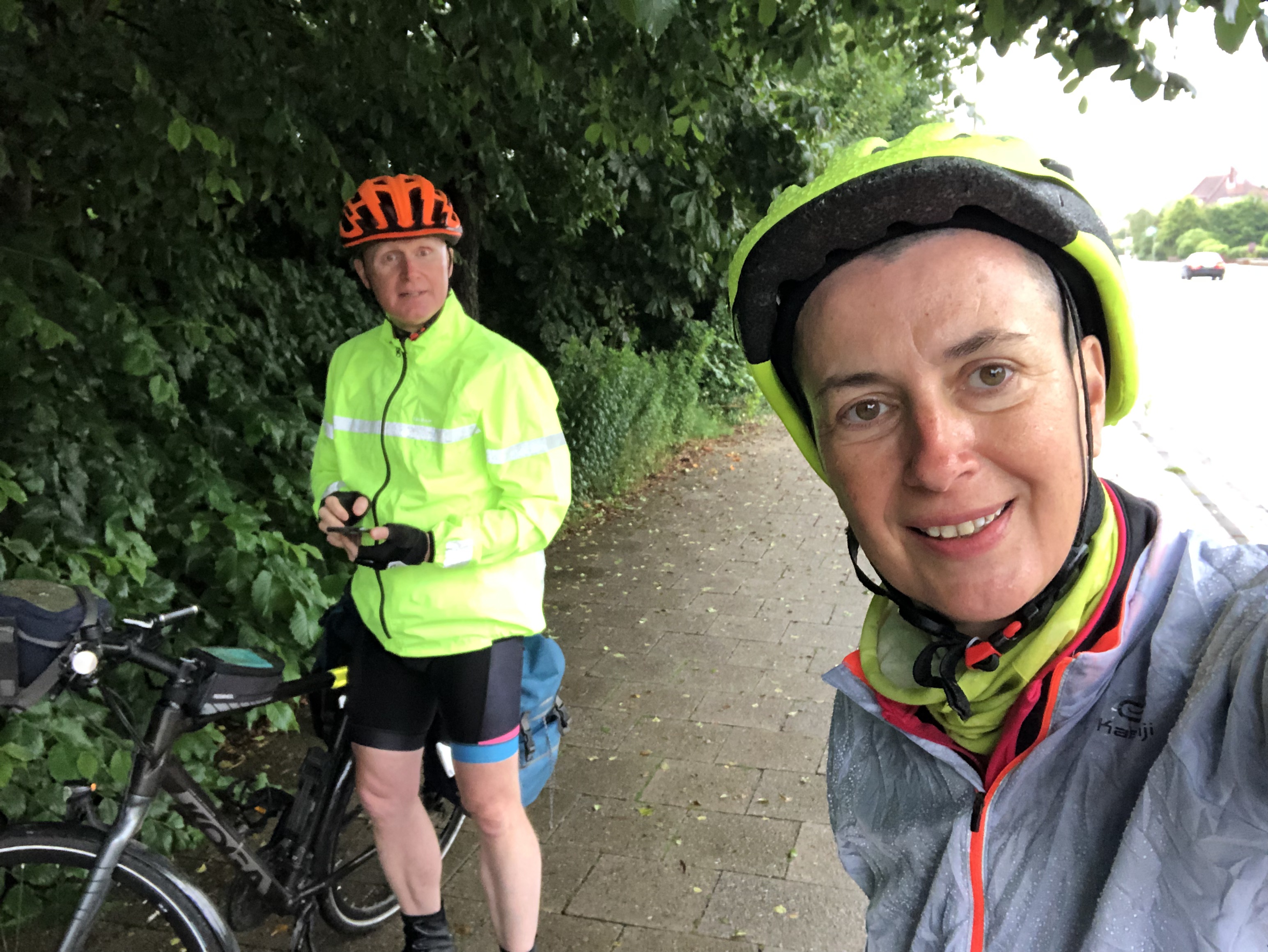 À 8h45, on se met en route, sous la pluie. On roule bien, il cesse de pleuvoir, après 7 km environ on entame la digue, ça va tout seul avec le vent dans le dos, on admire les paysages, la pluie qui tombe manifestement plus loin devant, plus loin à gauche, plus loin à droite, mais pas sur nous, bref c’est le bonheur, et puis Philipp m’appelle : son pneu avant est plat !