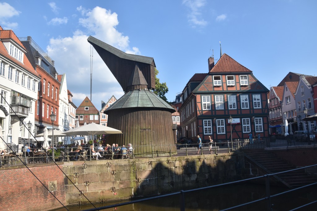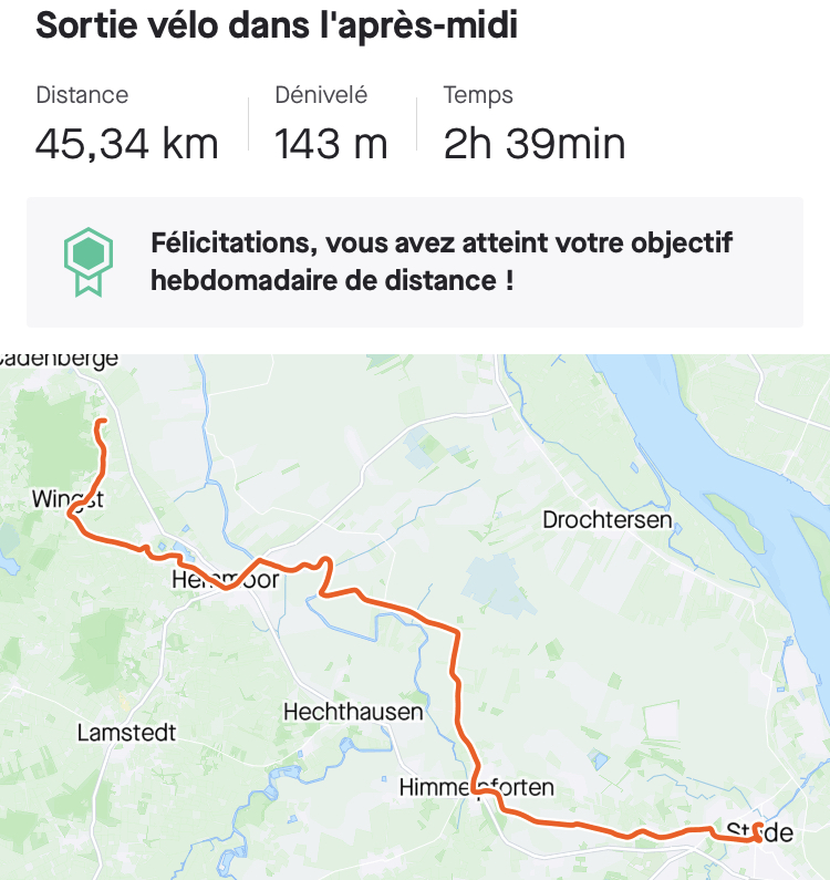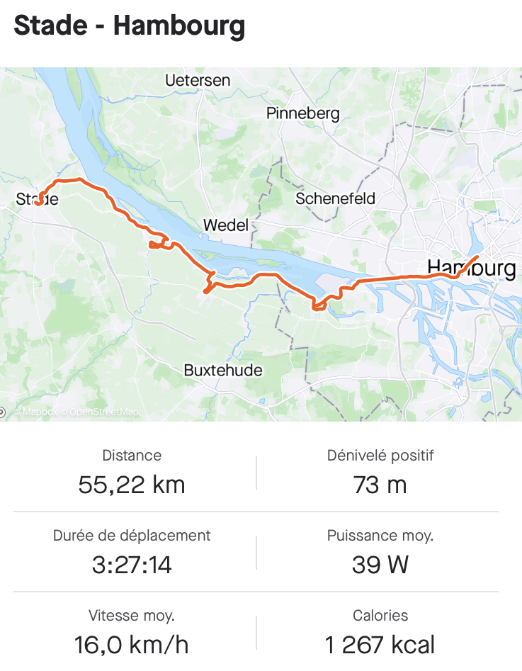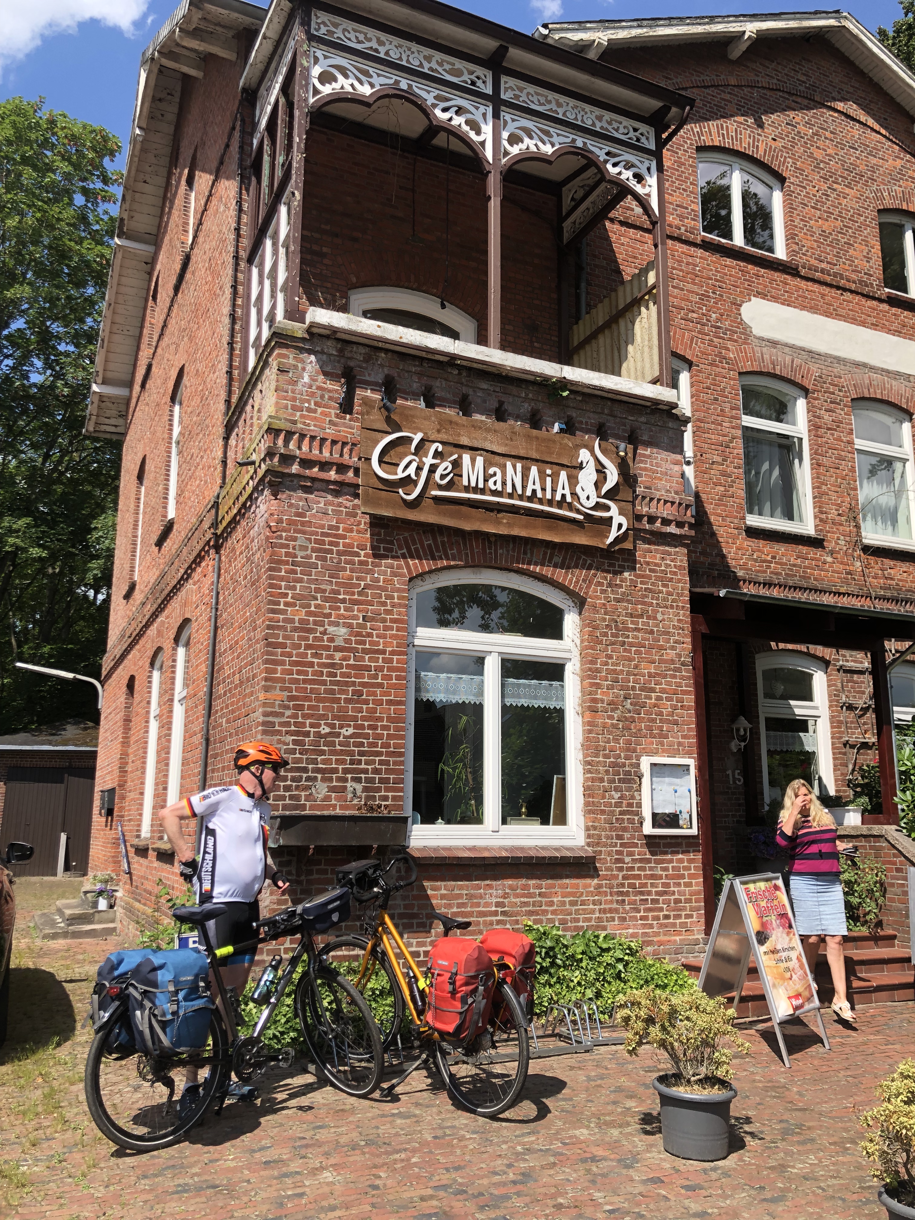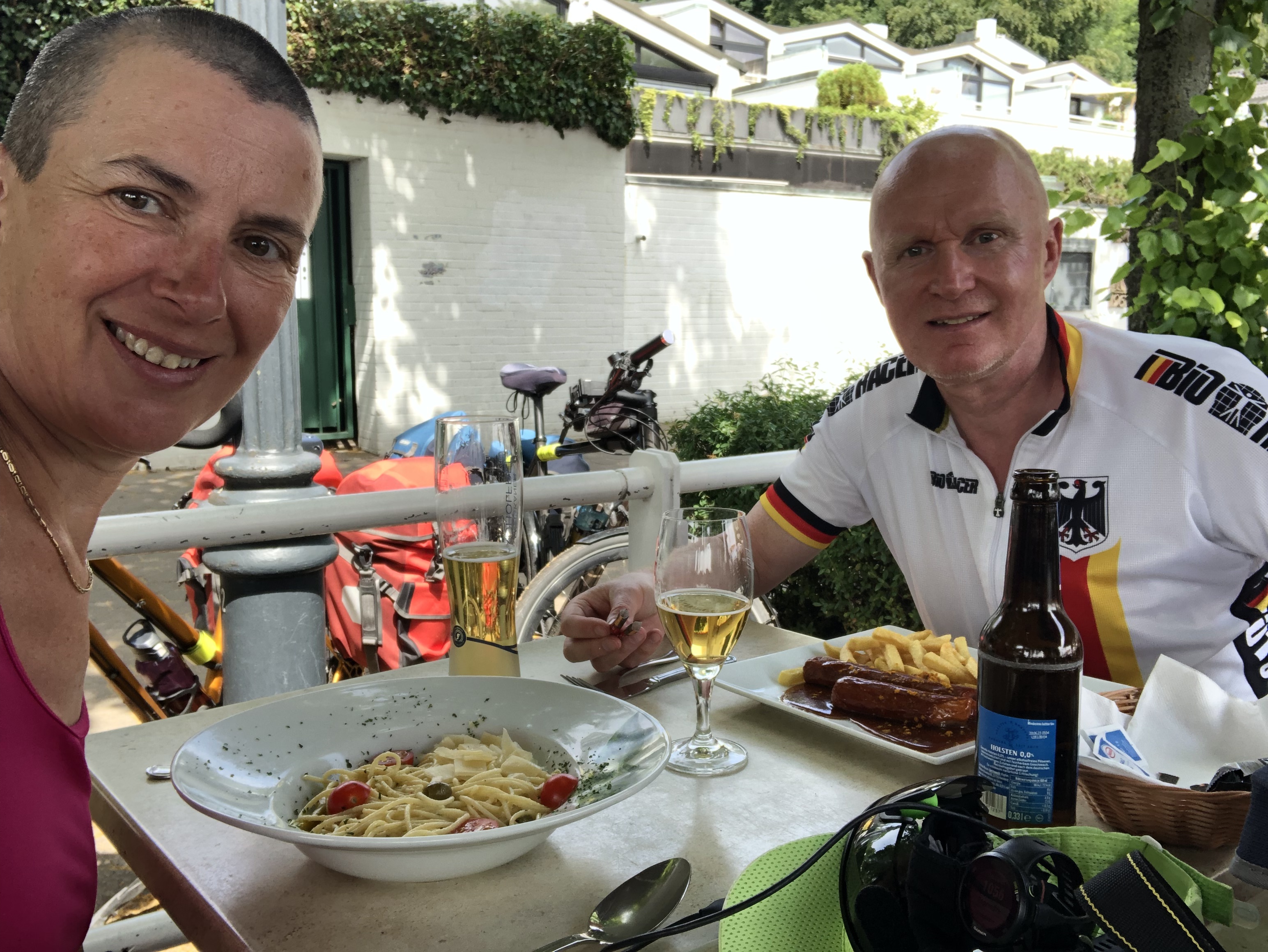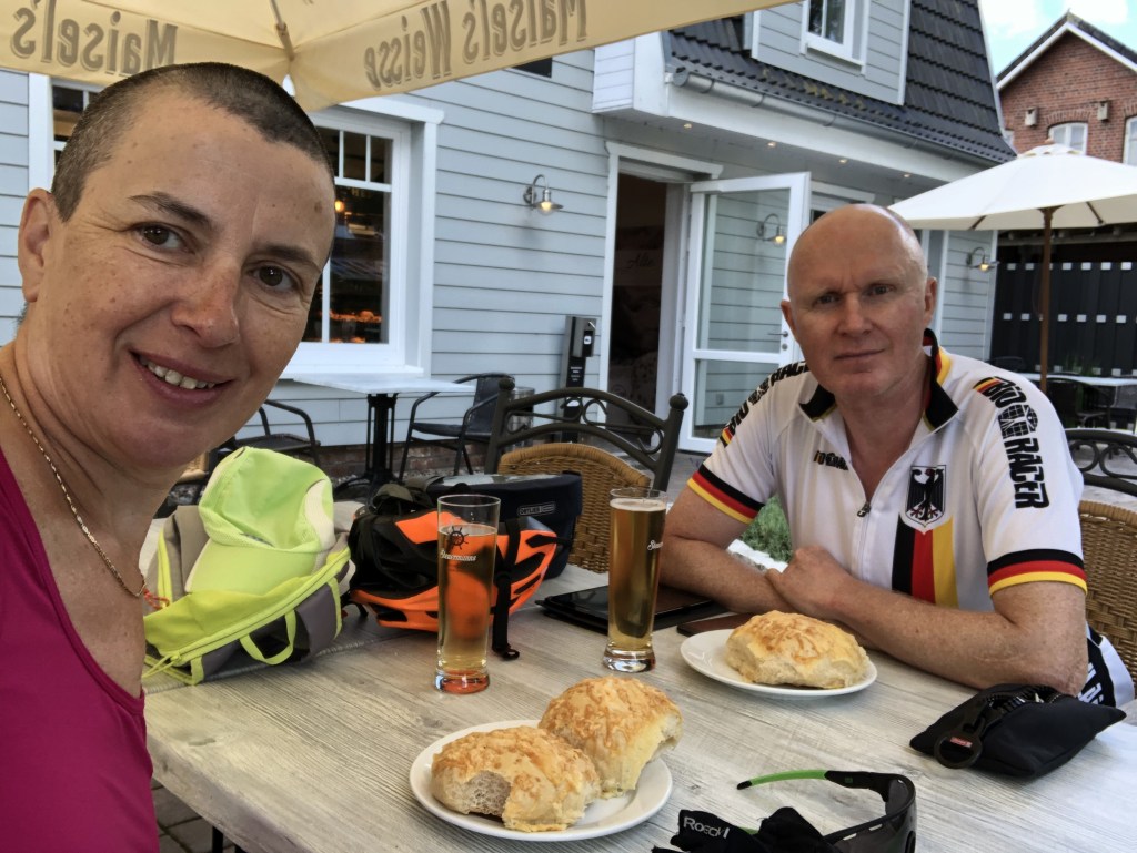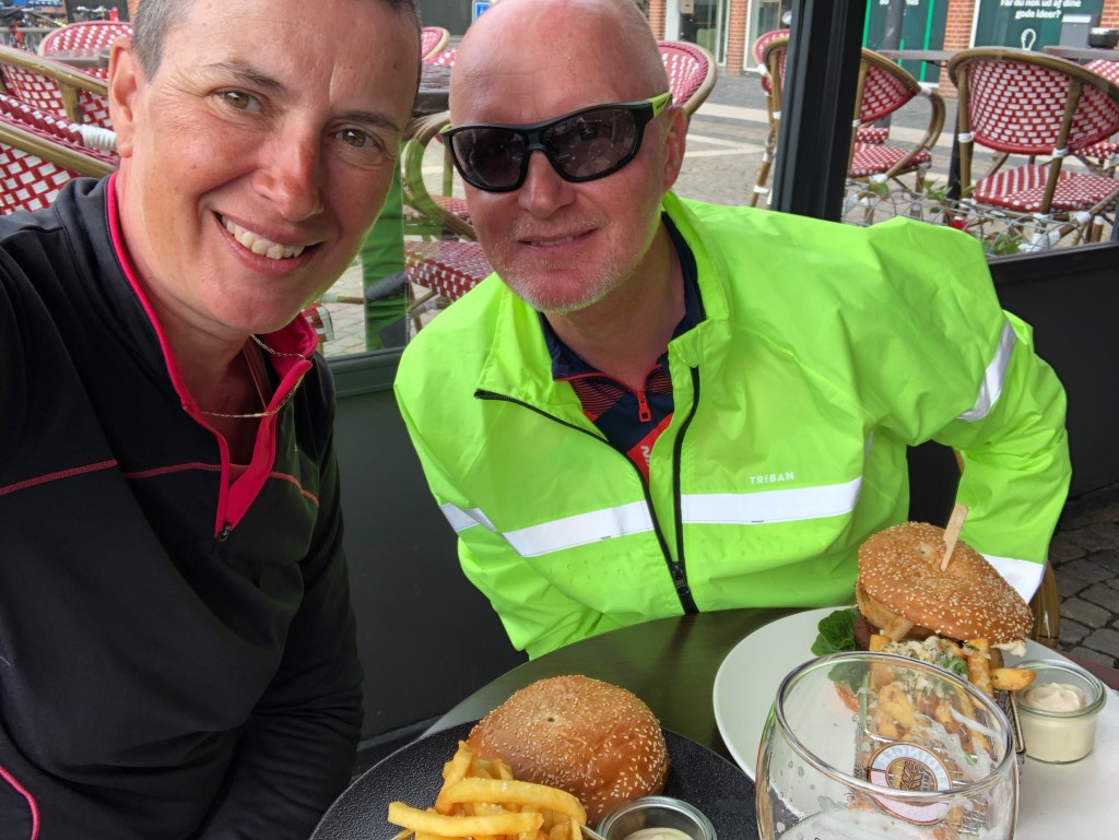 On commence à avoir envie de s’arrêter (en fait, on est crevés), mais il n’y a pas un établissement en vue, et comme notre B&B est assez excentré, on décide d’aller d’abord dans le centre, car on a pris la ferme résolution de ne pas poursuivre ce périple sans avoir fait l’acquisition d’une pompe et de deux chambres à air ! Quelques averses plus tard, on arrive donc à un magasin de vélos, on fait nos petits achats et on repart pour le centre-ville, où on arrive à 16h30. On s’installe à une terrasse, où commence par un cappuccino (moi) ou un chocolat chaud (lui), puis on décide de manger là, après tout il est presque 17h… On enchaîne donc avec une grande bière sans alcool et un cheeseburger végétarien.