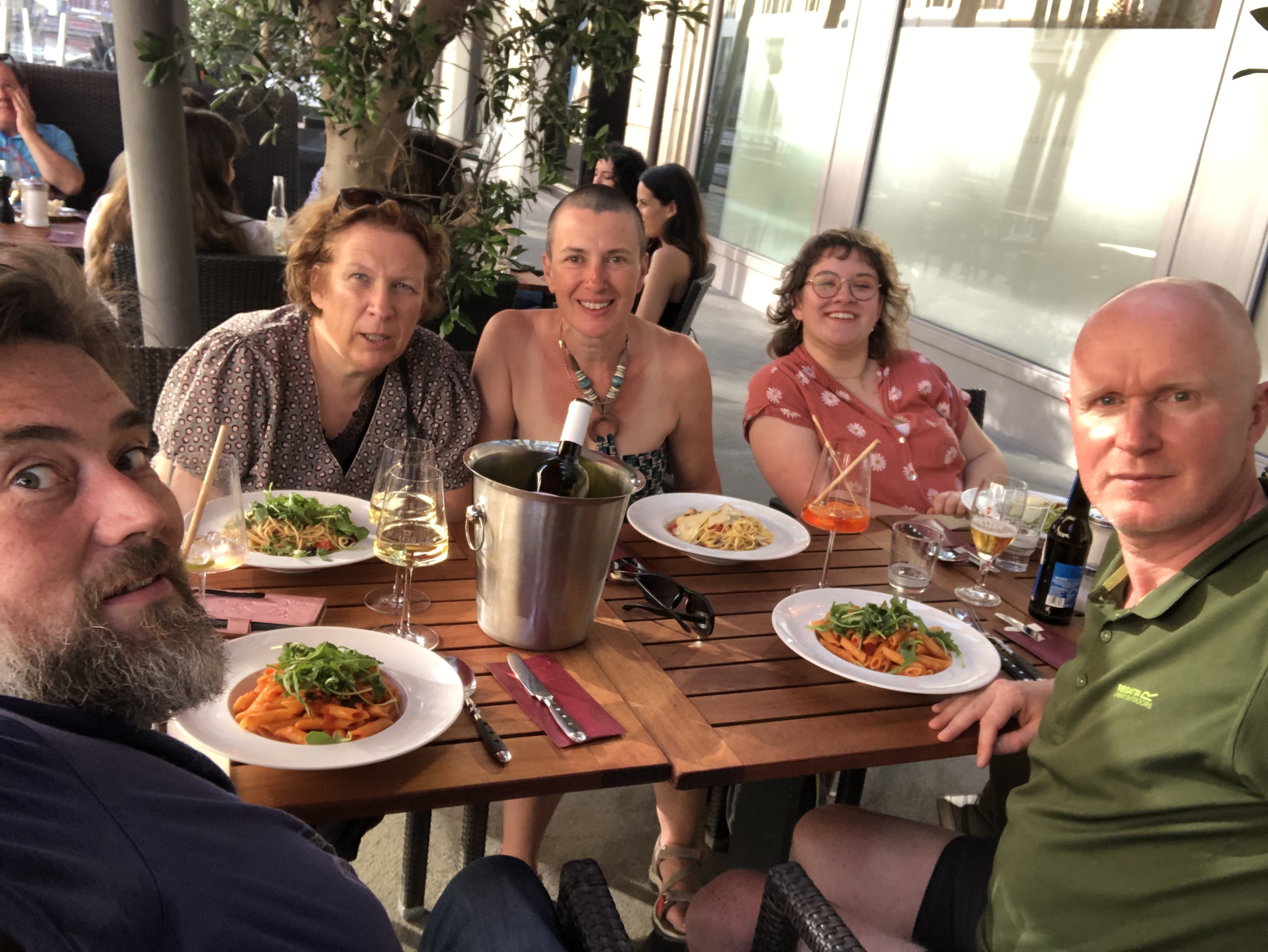 Éveil à 6h, un peu tôt, mais impression d’avoir très bien dormi, malgré un réveil vers minuit et un autre à 4h34. On craignait un peu le bruit le soir et la nuit, car hier on avait un groupe de six Danois juste devant notre fenêtre qui faisait un boucan pas possible en prenant joyeusement l’apéro, mais non, ils ont été sages comme des images ! À mon avis, c’est vraiment un logement pour randonneurs, comme annoncé, et tout le monde est au lit à 21h, fourbu !