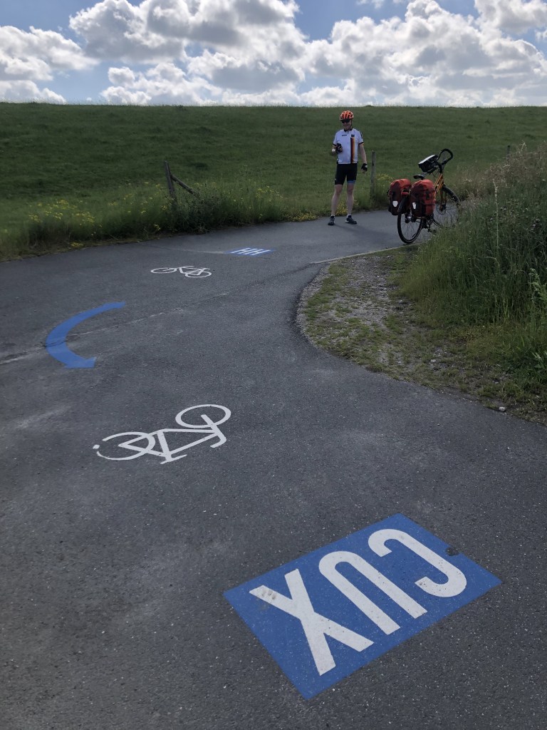 Arnaud, qui je pense trouverait ce périple trop plat, avec son Grimpe-Tout, et dont j’ai commencé ici à partager le goût pour les routes où les cyclistes cohabitent avec les voitures (surtout quand il n’y en a pas, de voitures…): les pistes cyclables, c’est bien quand leur revêtement est top, mais souvent la route est meilleure…