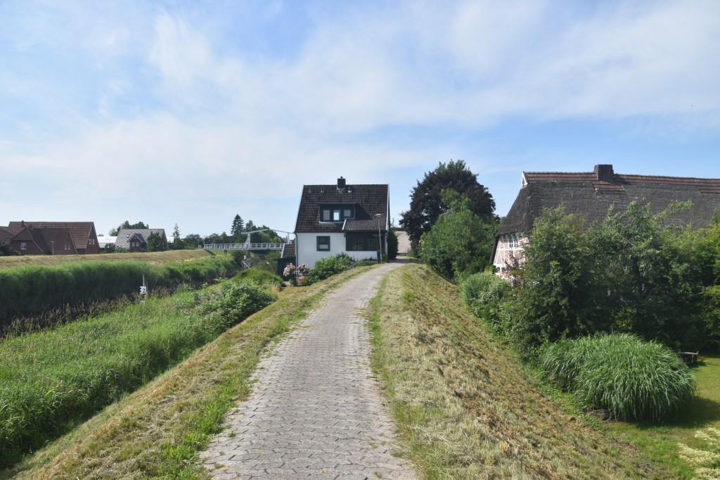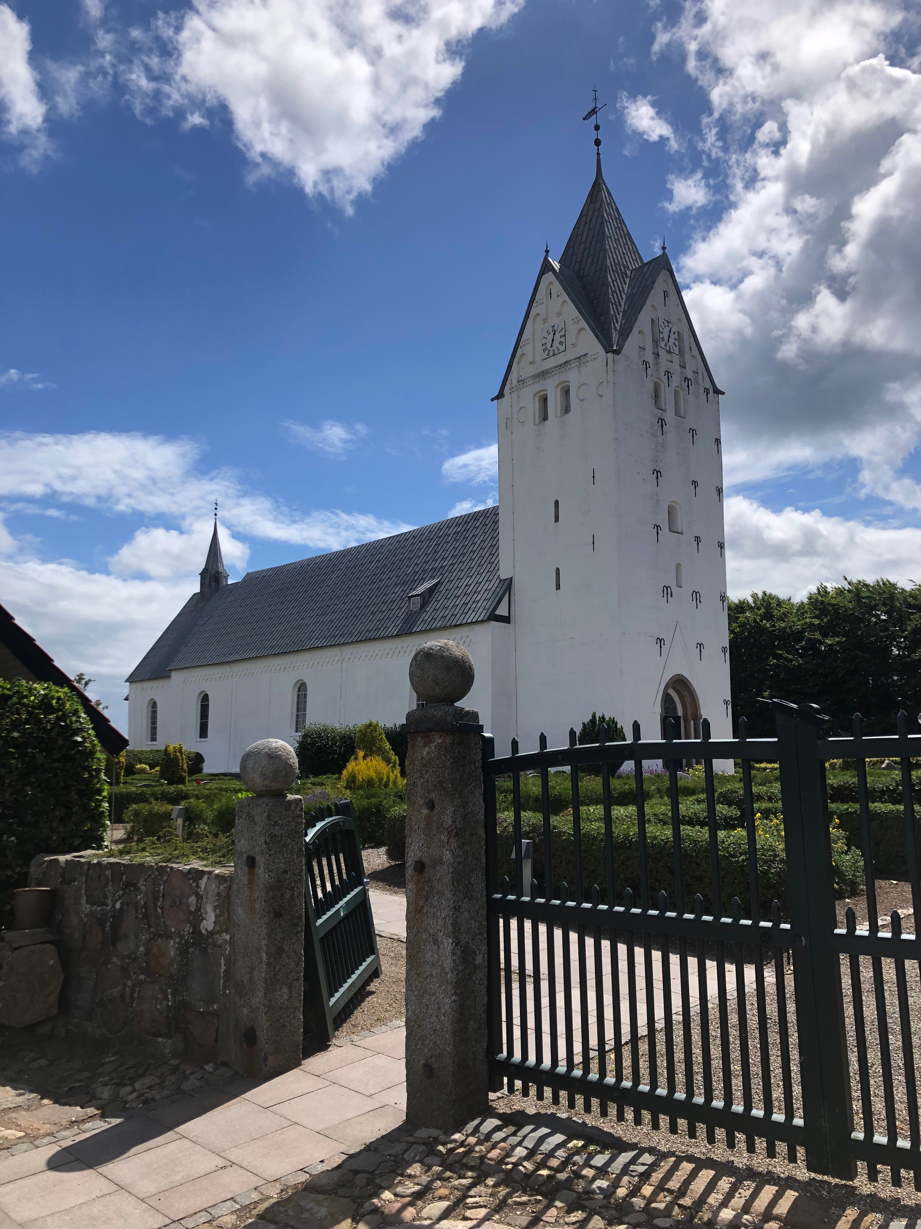 Heureusement, on finit par rejoindre une route asphaltée qui longe la digue, puis on traverse le village de Brøns, et on fait un arrêt devant sa très jolie église pour se mettre de la crème solaire.