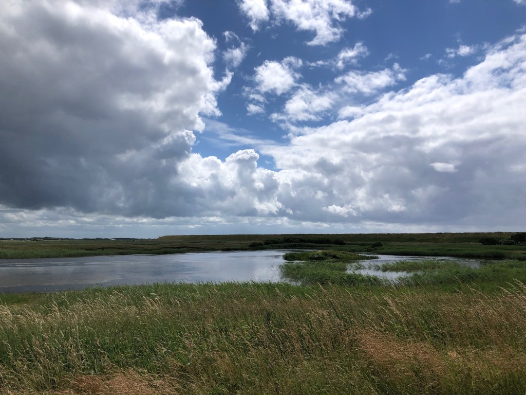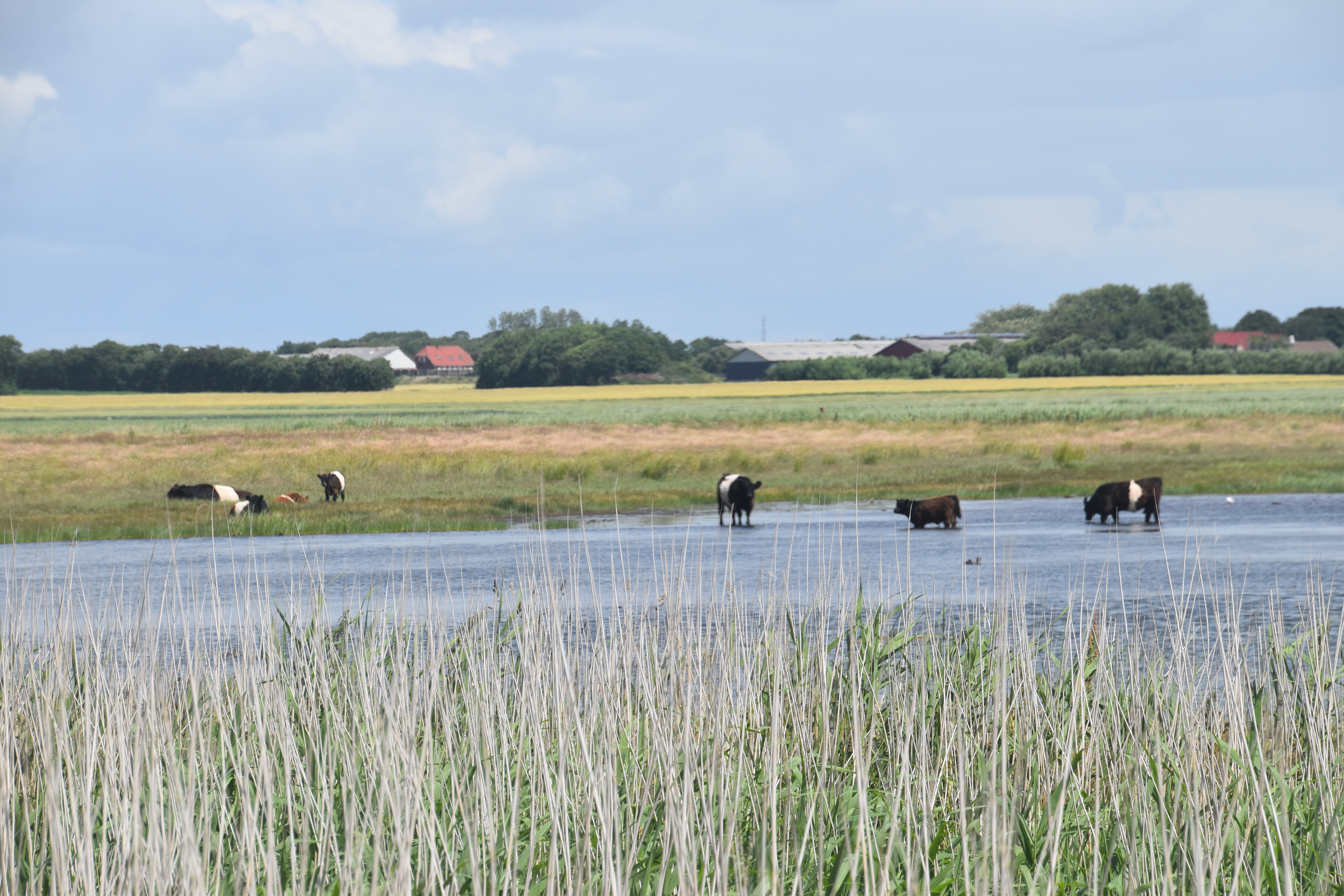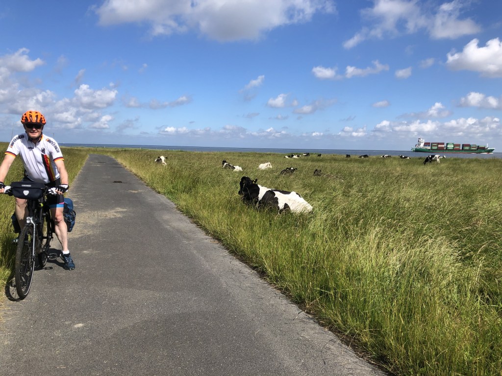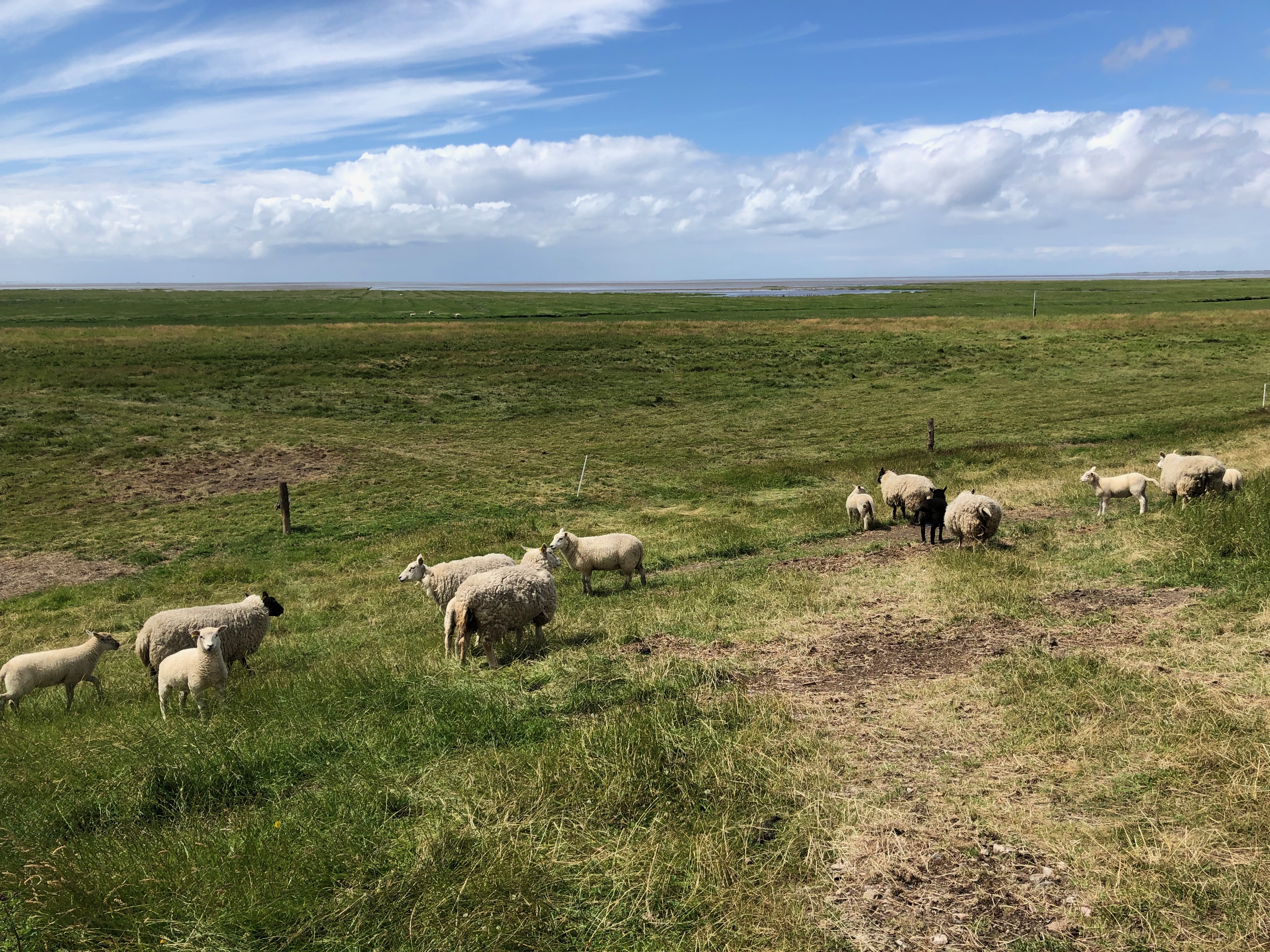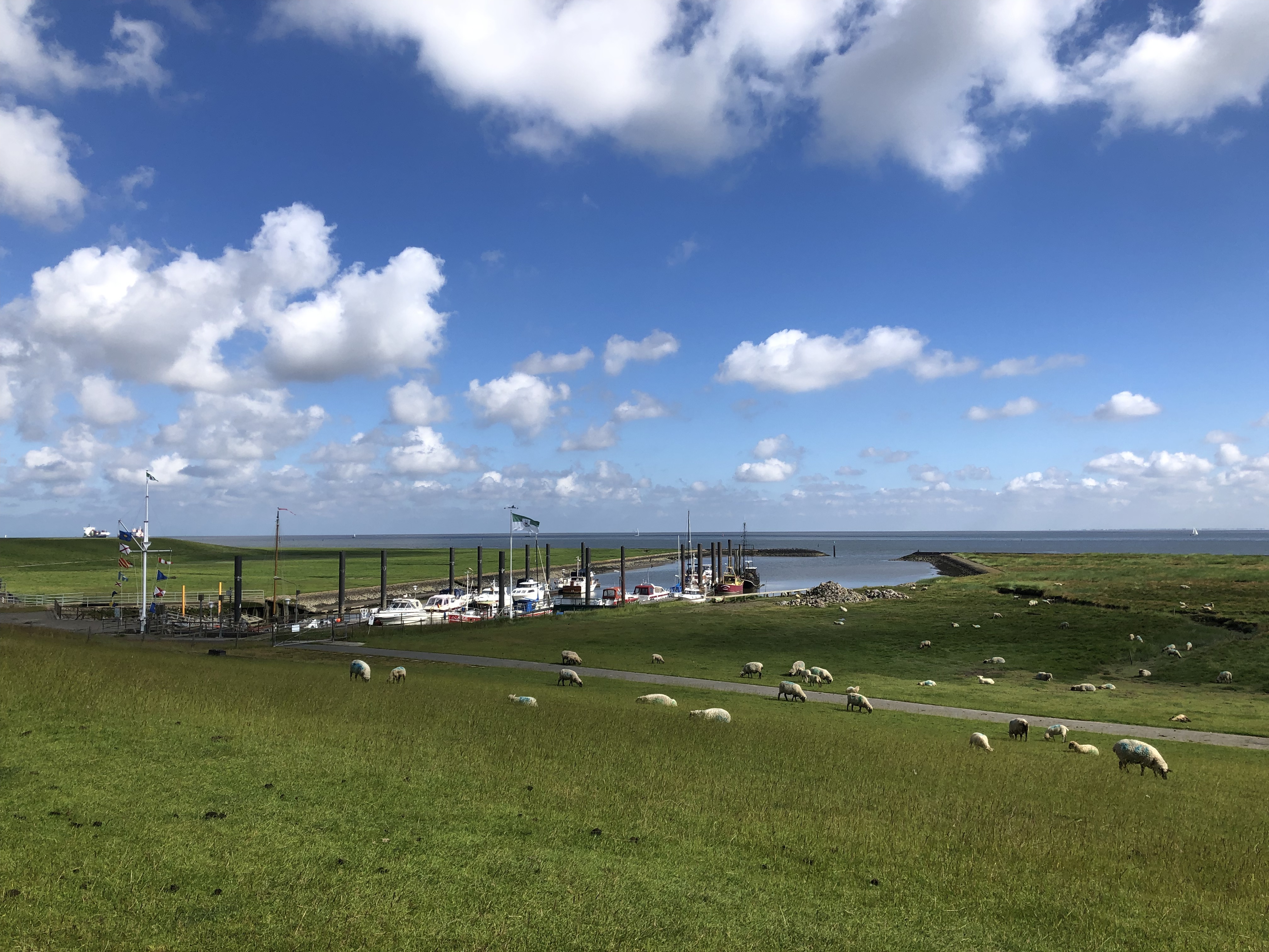 Nouvel épisode graviers, puis on atteint une magnifique piste cyclable qu’on n’arrêtera plus de suivre pendant plusieurs dizaines de kilomètres, le long de la digue. De l’autre côté, comme je le vérifie (profitant d’un des arrêts « Attends, j’enlève mes protège-chaussure », ou « Attends, j’ai oublié de remettre mes lunettes »), ce sont des paysages habituels des Wadden: des schorres, des moutons, des vaches, etc.
