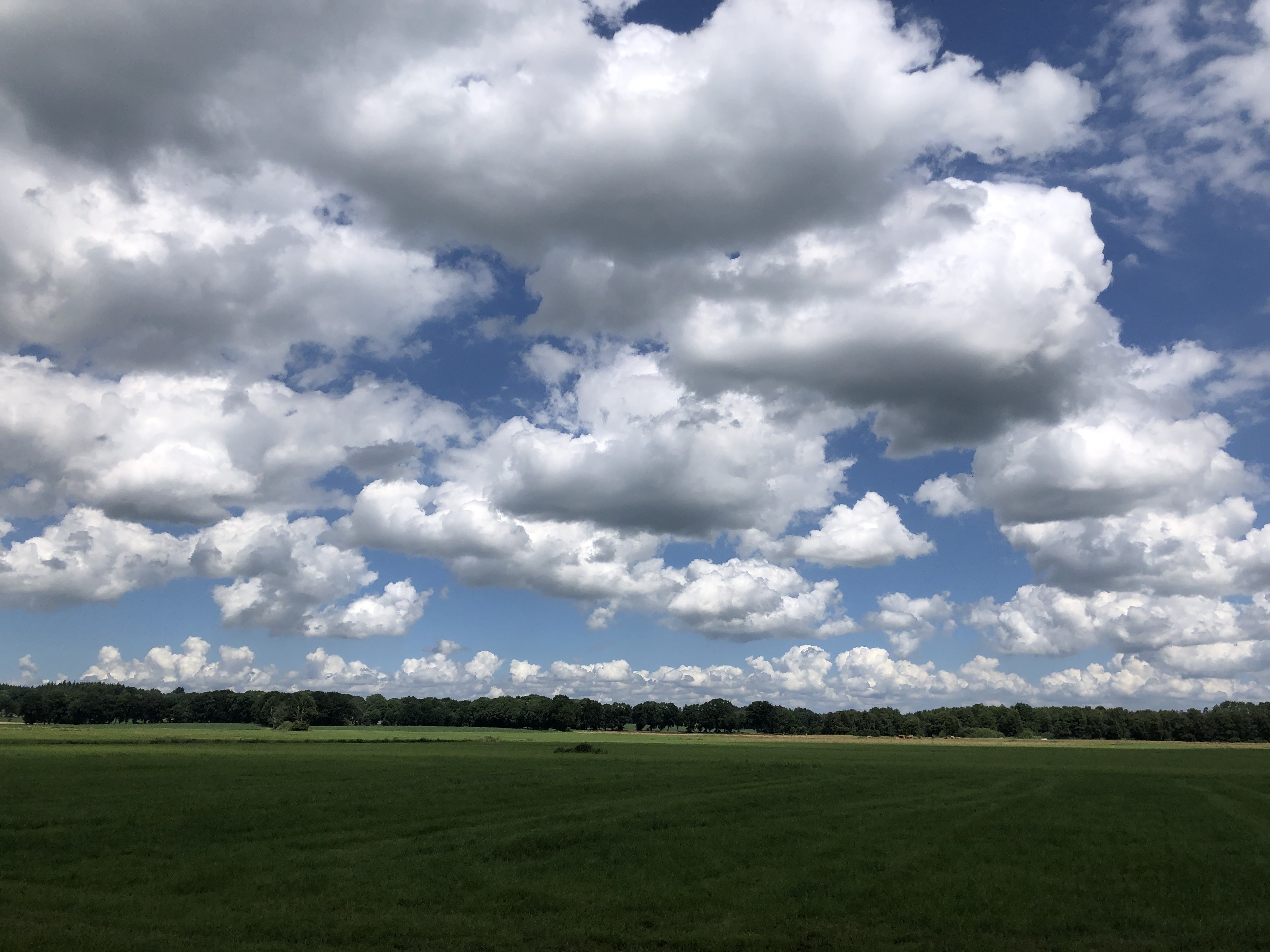Avec toutes ses averses, le ciel est magnifique, et les barrières allemandes ont fait place à des petits passages étroits (dont le sol est constitué de tubes métalliques espacés que les animaux ne peuvent emprunter) à gauche ou à droite de larges barrières, passages que je m’exerce à franchir, car je reste pas très douée pour les manoeuvres cyclistes…
